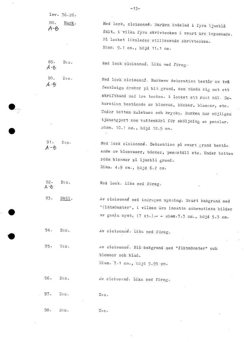 Inv. 36.20. 88. Burk. Med lock, cloisonng. Burken indelad i fyra ljusblå A -e, fält, i vilka fyra skrivtecken i svart äro inpassade. På locket likaledes stiliserade skrivtecken. Diam. 9.1 cm., höjd 11.1 cm. 89. D:o. Med lock cloisonng. Lika med föreg. Å -b 90. D:o. Med lock cloisonn2. Burkens dekoration består av två ,1 femkloiga drakar på blå grund, som vända sig mot ett skriftband med tre tecken. 1 locket ett runt häl. De- koration bestående av blomvas, böcker, blommor, etc. • Under botten kalebass och krycka. Burken har möjligen tjänstgjort som vattenkärl för sköljning av penslar. Diam. 10.1 cm., höjd 12.5 -cm. 01, 91. D:o. Med lock cloisonng. Dekoration på svart grund bestå- A-6 ende av blomvaser, böcker, pennställ etc. Under botten röda blommor på ljusblå grund. Diam. 4.9 cm., höjd 6.2 cm. D:o. Med lock. Lika med föreg. A-6 Skål. Av cloisonng med indragen mynning. Svart bakgrund med "flätmönster", i vilken äro insatta schematiska bilder av gamla mynt, (7 st.).— — Diam.7.3 cm., höjd 5.3 cm. D:o. Av cloisonng. Lika med föreg. Av cloisonn. Blå :.bakgrund med "flätmönster" och blommor och blad. Diam. 7.1 cm., höjd 5.95 cm. D:o. Av cloisonng. Likå med föreg. D:o. D:o. D:o. D:o. [ocr]