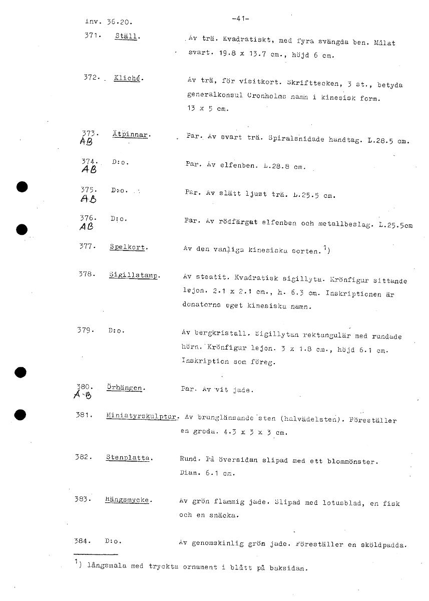 -41- lnv. 36.20. 371. Ställ. .Av trä. Kvadratiskt, med fyra svängda ben. Målat svart. 19.8 x 13.7 cm., höjd 6 cm. 372. Kliché. Av trä, för visitkort. Skrifttecken, 3 st., betyda generalkonsul Cronholm...