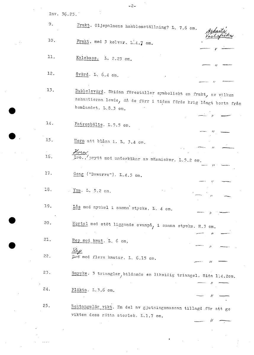 2 Inv. 36.25. 9. Frukt. Oljepalmens hanblomställning? L. 7.6 cm. 10. Frukt, med 3 kolyar. L.4.7 cm. 11. Kalebass. L. 2.25 cm. 12. Svärd. 1. 6.4 cM. 13. Dubbelsvärd. Skidan föreställer symboliskt en frukt, av vilken ashantierna levde1 då de förr i tiden förde krig långt borta från hemlandet. L.8.3 cm. Patronbälte. L.5.5 cm. Horn att blåsa i. L. 3.4 cm. Do., prytt med underkäkar av människor. L.5.2 cm. 17. Gona; ("Dawurru"). L.4.5 cm. 18. . Yxa. L. 5.2 cm. 19. Lås med nyckel i sammanstycke. L. 4 em. 20. Mortel med stöt.liggande ovanpå/ i samma stycke. H.3 cm. 21. Rep med knut. L. 6 cm. 22. j_ med flera knutar. 1. 6.15 cm. 23. Smycke. 3 trianglar bildande en liksidig triangel. Sida 14.2cm. 24. Fläkta. L.3.6 cm. 25. Rektangulär vikt. En del av gjutningsmassan tillagd.för att ge vikten dess rätta storlek. L.1.7 cm. [ocr]Stäng