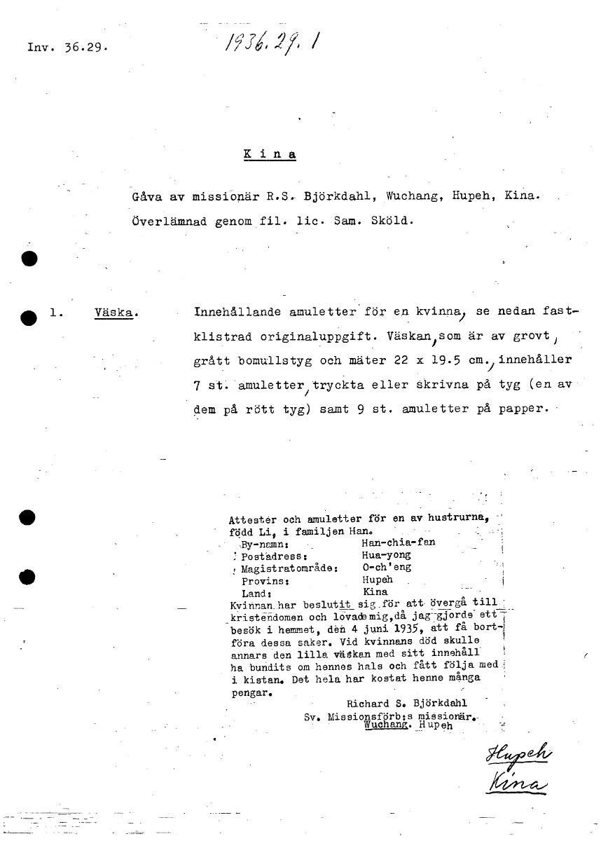 Inv. 36.29. Kina Gåva av missionär R.S. Björkdahl, Wuchang, Hupeh, Kina. Överlämnad genom fil. lic. Sam. Sköld. • 1. Väska. Innehållande amuletter för en kvinna, se nedan fast- klistrad originaluppgift. Väskan som är av grovt grått bomullstyg och mäter 22 x 19.5 cm./ innehåller 7 st. amuletter tryckta eller skrivna på tyg (en av dem på rött tyg) samt 9 st. amuletter på papper. Attester och amuletter för en av hustrurna, född Li9 i familjen Han. - - By-namn: - Han-chia-fan Postadress* Hua-yong Magistratområde: 0-ch'eng Provins: Hupeh Land: Kina Kvinnan_har beslutitsig.för att-övergå till-: kristendomen och lovademig9då jag-gjorde ett- besök i hemmet, dat 4 juni 19359 att få borti föra dessa saker. Vid kvinnans död skulle annars den lilla väskan med sitt innehåll ha bundits om hennes hals och fått följa med:; i kistan. Det hela har kostat henne många pengar. Richard S. Björkdahl Sv. Missionsförb:s miasionär.- WuohanK. Hupeh [ocr]