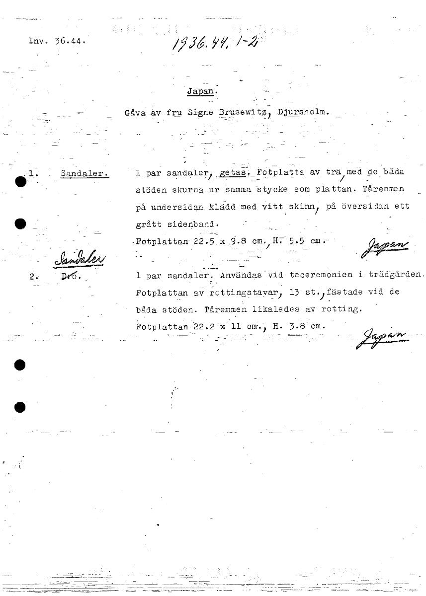 Inv. 36.44. »24'm /-2 Japan. Gåva av fru Signe Brusewitz Djursholm. Sandaler. 1 par sandalerI getas; Fotplatta av trä med de båda stöden skurna ur samma-stycke som plattan. Tåremmen på undersidan klädd med. vitt skinn/ på översidan ett grått sidenband. -Fotplattan- 22.5x _9.8 cm. H.- 5.5 cm. 1 par sandaler. Användas vid teceremonien i trädgården. Fotplattan av rottingstayar) 13 st7fästade vid de båda stöden. Tåremmen likaledes av rotting. Fotplattan 22.2-x 11 cm.; H. 3.8. cm. • [ocr]Stäng