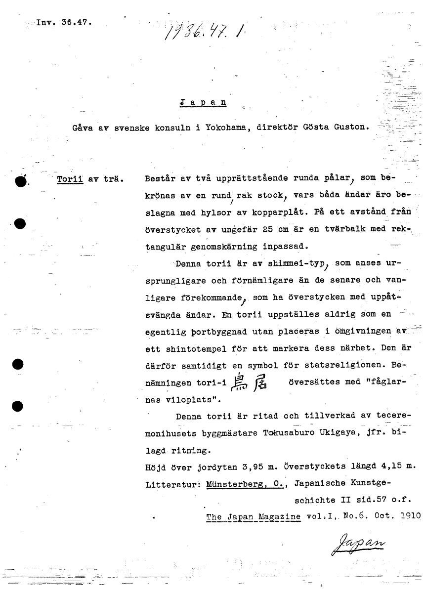 Inv. 36.47. apan Gåva av svenske konsuln i Yokohama, direktör Gösta Guston. Törii av trä. Består av två upprättstående runda pålar) som be- krönas av en rund rak stock vars båda ändar äro be- / slagna...