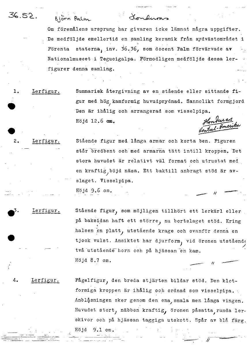 3C.51. Om föremålens ursprung har givaren icke lämnat några uppgifter. De medföljde emellertid en samling keramik från sydvästoffirådet i Förenta staterna J inv. 36.36 som docent Palm förvärvade av Nationalmuseet i Tegucigalpa. Förmodligen medföljde dessa ler- figurer denna samling. 1. Lerfigur. Summarisk återgivning av en stående eller sittande fi- gur med höglkamformig huvudprydnad. Sannolikt formgjord Den är ihålig och arrangerad som visselpipa. Höjd 12.6 am. 2. Lerfigur. Stående figur med långa armar och korta ben. Figuren står bredbent och-med armarna tätt intill kroppen. 'Det stora huvudet är relativt väl format och utrustat med en kraftig böjd näsa. Ett baktill anbragt stöd är av- slaget. Visselpipa. Höjd 9.6_cm. Lerfigur. Stående figur) som möjligen tillhört ett lerkärl eller på baksidan haft ett större) nu bortslaget stöd. Kring halsen :en platt utstående krage och ovanför denna en tjock vulst. Ansiktet har djurform) vid öronen utståend( två -utståencIA-horn och på hjässan en kam. Höjd 8.7 cm. 4. Lerfigur. Fågelfigur) den breda stjärten bildar stöd. Den klot- formiga kroppen är ihålig och ordnad som visselpipa. • Anblå.sningen sker genom den ena/smala men långa vingen. Huvudet stort / näbben kraftig/ öronen påsatta runda ler- skivor och på hjässan taggiga utskott. Spår av blå färg. Höjd 9.1 cm. // [ocr]Stäng