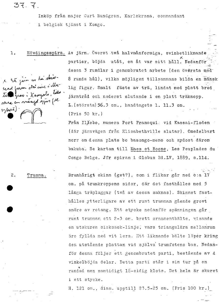 Inköp från major Curt Rundgren, Karlskrona, commandant belgisk tjänst i Kongo. 1. Hövdingtspira. Av järna Överst två halvmånformiga, svinbetliknande x _ partier, böjda utåt, en åt var sitt håll. Nedan...