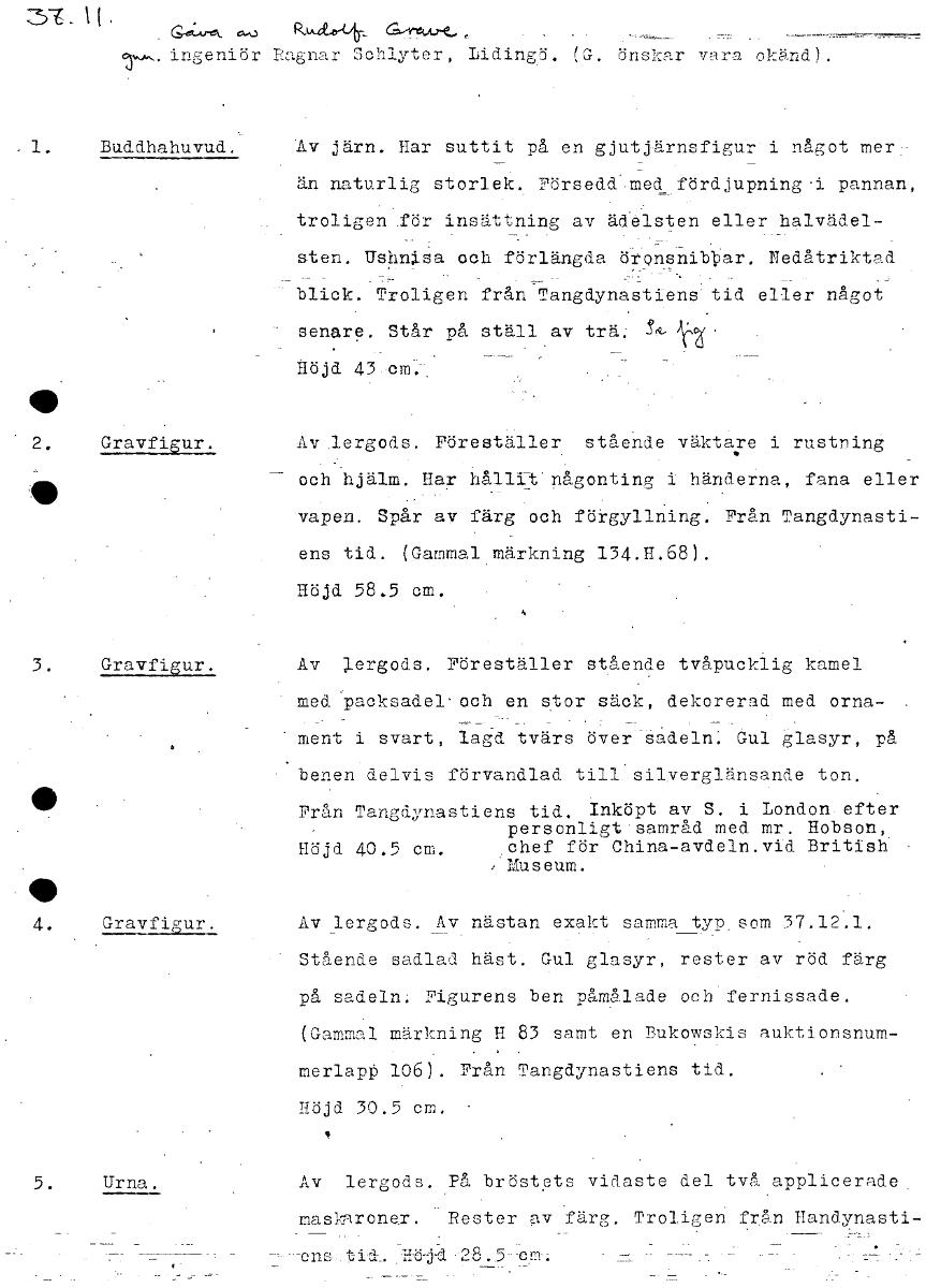 37_ Gr RM4.4).-(4 ingenjör Ragnar Schlyter, Lidingö. (G. önskar vara okänd). - 1. Buddhahuvud. Av järn. Har suttit på en gjutjärnsfigur i något mer:- än naturlig storlek. Försedd med fördjupning-i pannan, troligen för insättning av ädelsten eller halvädel- . _- sten. Ushnisa och förlängda öronsnibbar. Nedåtriktad blick. Troligen från Tangdynastiens tid eller något senare. Står på ställ av trä: fo. /h. Höjd 43-cm.. 2. Gravfigur. Av .lergods. Föreställer stående väktare i rustning och hjälm. Har hållit • någonting i händerna, fana eller vapen. Spår av färg och förgyllning. Från Tangdynasti- ens tid. (Gammal märkning 134.H.68). Höjd 58.5 cm. 3. Gravfigur. Av Tergods. Föreställer stående tvåpucklig kamel med packsadel.och en stor säck, dekorerad med orna- ment i svart, lagd tvärs över sadeln. Gul glasyr, på benen delvis förvandlad till silverglänsande ton. Från Tangdynastiens tid. Inköpt av S. i London efter personligt samråd med mr. Hobson, Höjd 40.5 cm. chef för China-avdeln.vid British • Museum. 4. Gravfigur. Av lergods. Av nästan exakt samma typ.snm 37.12.1. Stående sadlad häst. Gul glasyr, rester av röd färg på sadeln. Figurens ben påmålade och fernissade. (Gammal märkning H 83 samt en Bukowskis auktionsnum- merlapP 106). Från Tangdynastiens tid. Höjd 30.5 cm. 5. Urna. Av lergods. På bröstets vidaste del två applicerade. maskroner. Rester av färg. Troligen från Handynasti- eng tid. aö-td 28.5-cm. [ocr]
