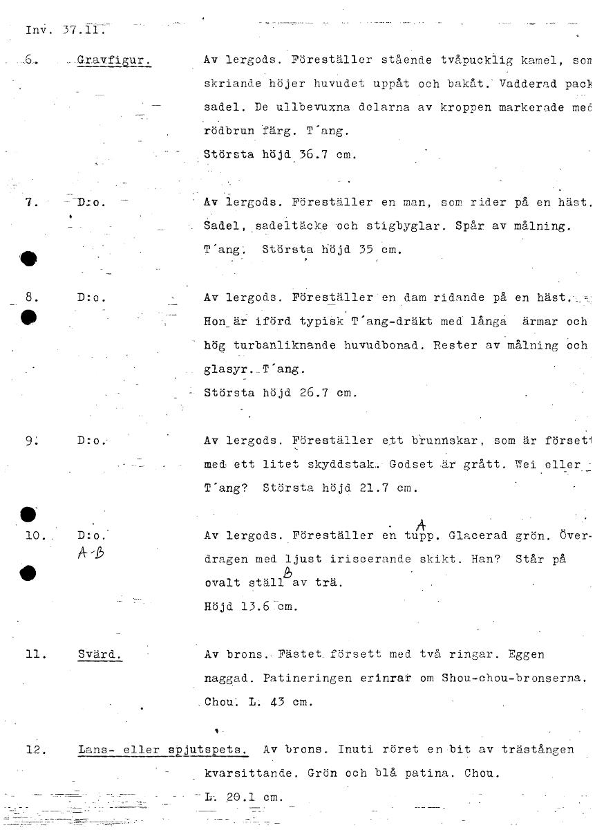 Inv. 37.11. .Gravfiuur. Av lergods. Föreställer stående tvåpucklig kamel, son skriande höjer huvudet uppåt och bakåt. Vadderad pac1 sadel. De ullbevuxna delarna av kroppen markerade me rödbrun färg_ Vang. .Största höjd 36.7 cm. D:o. Av lergods. Föreställer en man, som rider på en häst. • Sadel, sadeltäcke och stigbyglar. Spår av målning. Vang Största höjd 35 cm. • 8. D:o. Av lergods. Föreställer en dam ridande på en häst._ Hon_är iförd typisk T'ang-dräkt med långå ärmar och hög turbanliknande huvudbonad. Rester av målning och glasyr.~T'ang. Största höjd 26.7 cm. 9: D:o. Av lergods. Föreställer ett brunnskar, som är försett med ett litet skyddstak..- Godset är grått. Wei eller - T'ang? Största höjd 21.7 cm. 10.. D:o. Av lergods. Föreställer en tupp. Glacerad grön. Över- A -3 med ljust Han? dragen iriscerande skikt. Står på ovalt ställav trä. Höjd 13.6 cm. 11. Svärd. Av brons- Fästet försett med två ringar. Eggen naggad. Patineringen erinrat om Shou-chou-bronserna. .Chou: L. 43. cm. 12. Lans- eller spjutspets. Av brons. Inuti röret en •bit av trästången kvarsittande. Grön och blå patina. Chou. Z. 20.1 cm. [ocr]Stäng