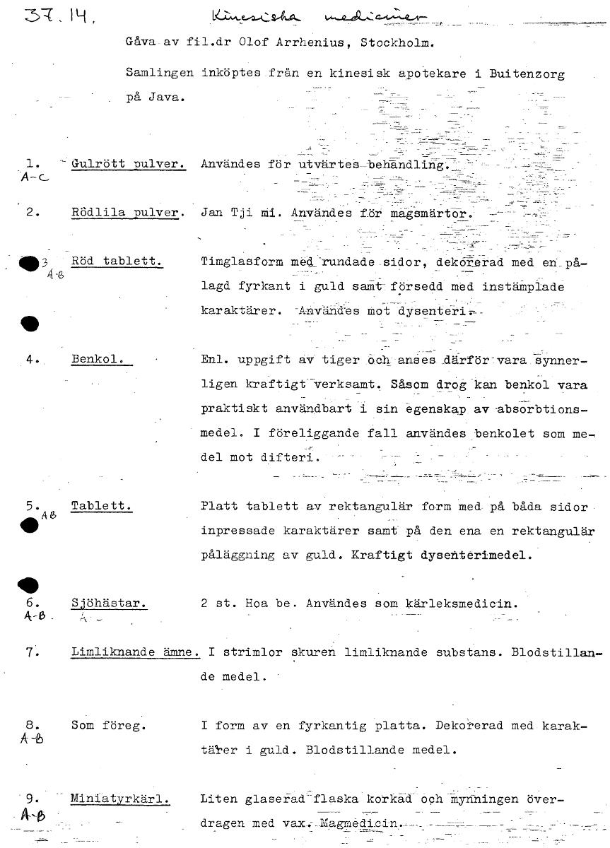 • G åv a av fil.dr Olof Arrhenius, Stockholm. Samlingen inköptes från en kinesisk apotekare i Buitenzorg på Java. 1. -Gulrött 21221.1, Användes för utvärtes_tehändling "A-c- 2. R6dlila pulver. Jan Tji m... Visa hela