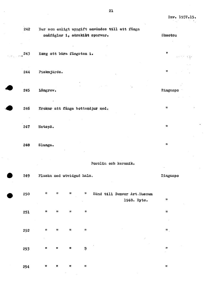 • 21 Inv. 1937,15. 242 Bur eon enligt uppgift användee till att fa emåfåglar i särskiit sparvar, Shuotau 243 Korg att bära fångsten 244 Plekmjärde, 419 245 Långrev, RinganP° 4110 246 Krokar att fånga be... Visa hela