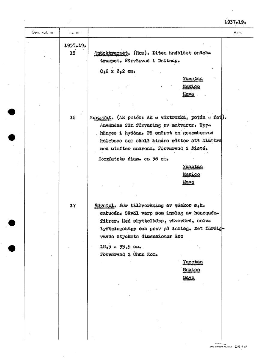 1937,19. 1937,19p näektrumkg1. (Hoa). Liten ändblået 0 trumpet. Pörvärvad i Dzitnup. 0,2 x 692 em. Yueatan Mexico rysa . 16 Kofta (Åk petdne Åk = växtranka0 potdn = fa Användee för. förvaring av matvaror. lipp hängee 1 hyddan. På Snöret en Genomborra(' kalebass( som ekall hindra råttor att klättr ned utefter snörena Nyvärvad i IMM. Körgeatets diam. ca 56 em. YUcatan , ~leo 3.7 Vävstol. Ethr tillverkning av väskor o.k. eabuedn. Såväl varp gom inslag av henequanå. fibrer. Ued okyttelkäpp0 vävsvärd0 13ftn4nGekäPP Och prov på inslag. Det färdi a vävda styckats dimensioner äro 1805 x 33,5 om., Pärvärvad i allan KOM* Yueatan 'Mexico [ocr]