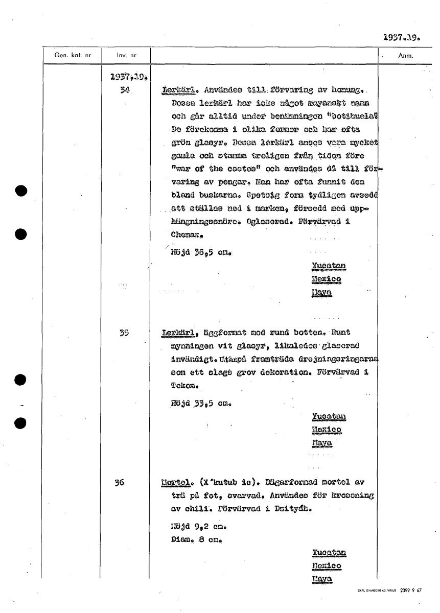 1937490 1931.19,. 34 Lerkärl. Användes till:förvaring av honnDessa lerkärl har loko något trayanekt namn och Går alltid under bonämningon "ot4huolag Be förekomma i olika former och bnm ofta grön glasyr. DOOGQ lerkärl an000 ‘47,rn mUckö, gamla och etamma troligen från tiPpY4 före "war of the caotoe" och användes aa ull g.' vnring av pongar. Han har ofta funnit dom bland buokarma. Spetok form tydligen aveed tt etällao ned i marken, föreodd med upp» härnoo Olorad. Förvärvad 1 Chenaxo nöjd 3605 cm. Yueatan Mexico ;Ina Lerkärl, äggformat mod rund botten, Runt mYnningon vit glaoyr, likaloden'elacerad invändigtonånpa framträda drejningeringar eom ett olaga grov dekoration. Förvärvad 1 Tekomi ,33,5 cm. Yueatan 4.12a4a agn 36 !Aorta0 (ekutub lo). Bagarformad mortel av trä pa fot, °varvad. Använde° för krooening av chili. Förvärvad i DnitYdho IÖ3d 9,2 em. Diam. 8 em. Yueatan nonie° Ian [ocr]