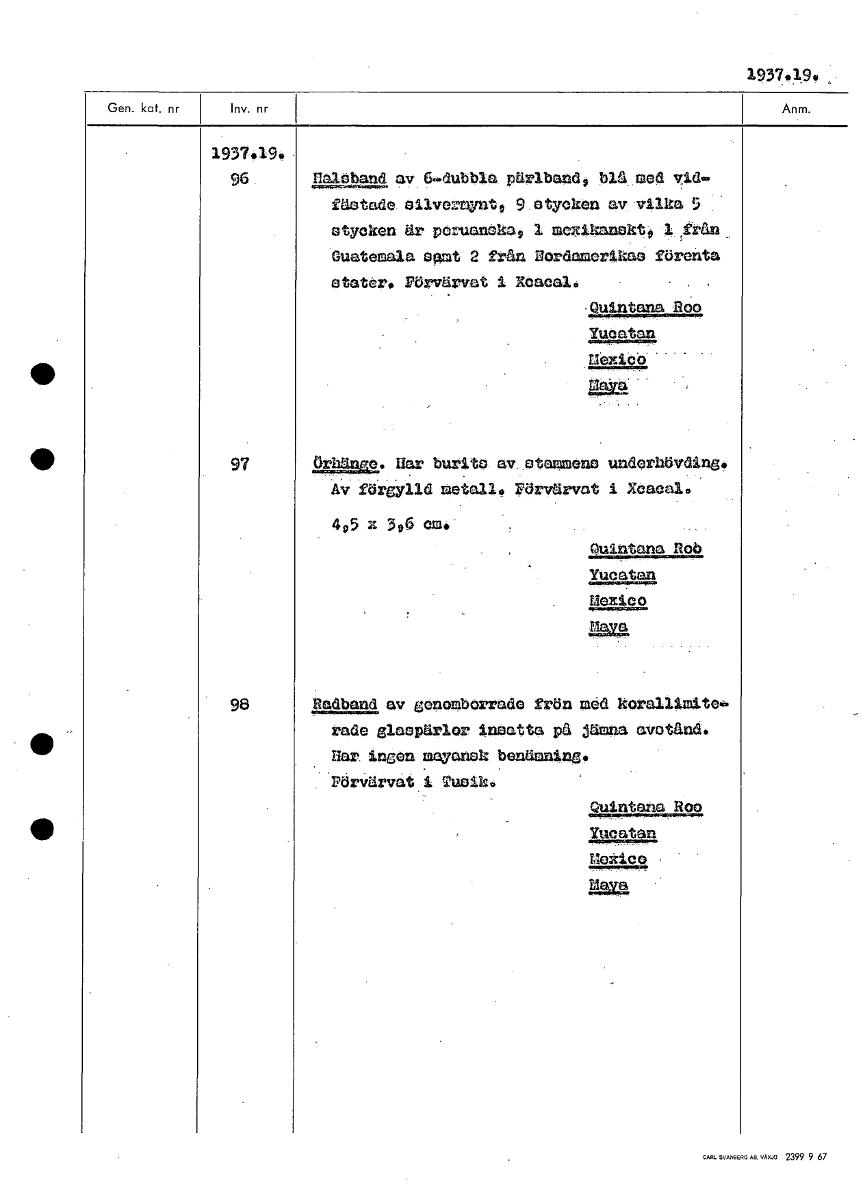 193749. 1937.19. 96 nalOband av 6-dubbla pärlband, blå. med vid- fästade silvermynt, 9 °tycken av vilka 5 stycken är peruanbka, 1 mcgikanakt, 1,fran Guatemala somt 2 från Nordamerikas förenta stater. Pörvärvat i Xcacale Quintana Res Yucatan nexica " 24Y.A. 97 Orhänpe. ilar burits av stammens underhövding. Av föraylld nmtall. Pörvärvat 1 Xcacalo 4 5 z 306 ou. Ouintana Io Yucatan Mexico 98 Radband av genomborrade frön med korallimiteg• rade glaspärla:sr insatta på jämna avstånd. Har inGenmayansk benämnina. Pörvärvat i Tuella° Quintena Ros Yucatan Mattes [ocr]