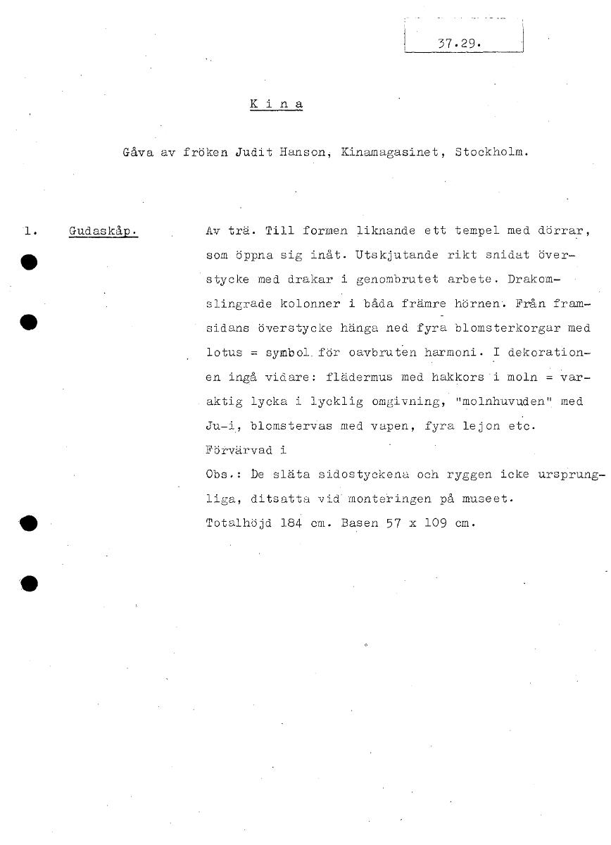 37.29. Kina Gåva av fröken Judit Hanson, Kinamagasinet, Stockholm. 1. Gudaskåp. Av trä. Till formen liknande ett tempel med dörrar, som öppna sig inåt. Utskjutande rikt snidat överstycke med drakar i genombrutet arbete. Drakomslingrade kolonner i båda främre hörnen. Från framsidans överstycke hänga ned fyra blomsterkorgar med lotus = symbol. för oavbruten harmoni. I dekorationen ingå vidare: flädermus med hakkors i moln = varaktig lycka i lycklig omgivning, "molnhuvuden" med Ju-i, blomstervas med vapen, fyra lejon etc. Förvärvad i Obs.: De släta sidostyckena och ryggen icke ursprungliga, ditsatta vid monteringen på museet. Totalhöjd 184 cm. Basen 57 x 109 cm. [ocr]