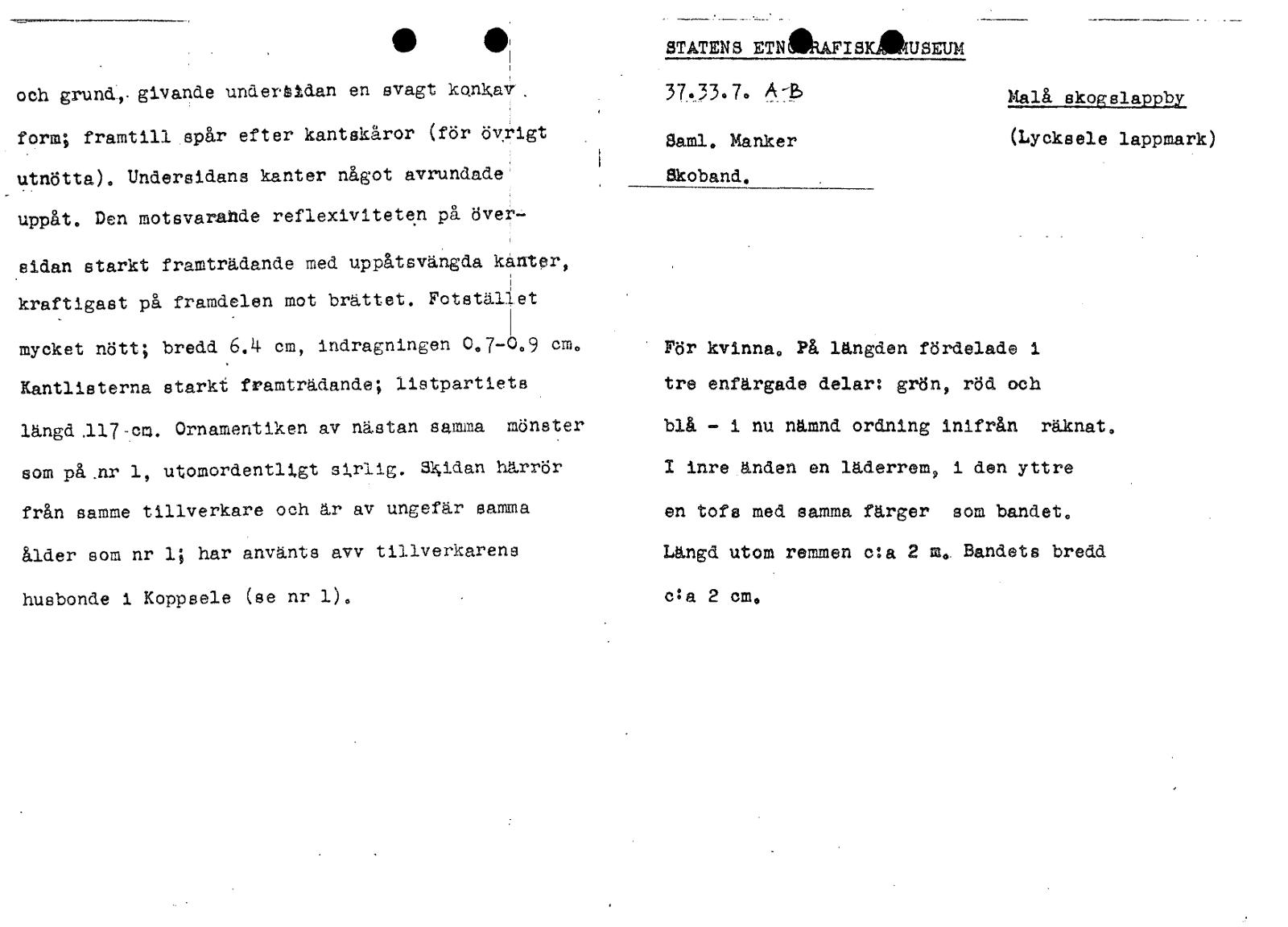 STATENS ETAILAFISKAUSEUM underåldan en svagt konkaV'. A och grund.,. givande 37....33.7. -15 Malå skogslaPPIDI form; kantskåror (för framtill spår efter övrigt Saml. Manker (Lycksele lappmark) utnötta). Undersidans kanter något avrundade Skoband. uppåt. Den motsvarade reflexiviteten på över sidan starkt framträdande med uppåtsvängda kanter, kraftigast på framdelen mot brättet. Fotstället mycket nö...