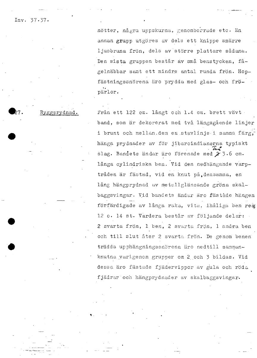 Inv. 37.37. nötter, några uppskurna, genombo7rrade -etc. En annan grupp utgöres av dels ett knippe smärre ljusbruna frön, dels av större plattare sådana. Den sista gruppen består av små benstycken, få- gelnäbbar samt ett mindre antal runda frön. Hop- fästningssnörena äro prydda med glas- och frö- pärlor. Ryggprydnad. Från ett 122 cm. långt och 1.4 cm. brett vävt band, som är dekorerat med två längsgående linjer i brunt och mellan.dem en .stavlinje-i samma färg, • . hänga prydnader av för jibaroindianerna typiskt slag. Bandets ändar äro förenade med/2-3.6 cm. långa cylindriska ben. Vid den nedhängande varp- tråden är fästad, vid en knut på,densamma, en lång hängprydnad av metallglänsande gröna skal- baggsvingar. Vid bandets ändar äro fäst .de hängen förfärdigade av låna raka, vita. ihåliga ben res; 12 o. 14 st. Vardera består av följande delar: 2 svarta frön, 1 ben, 2 svarta frön, 1 andra ben och till slut åter 2 svarta frön. De genom benen. trädda upphängningssnbrena äro nedtill samman- ' knutna varigenom grupper om 2 och 3 bildas. Vid dessa äro fästade fjädervippor av kula och röda fjädrar'och hängprydnader av skalbaggsvingar. [ocr]