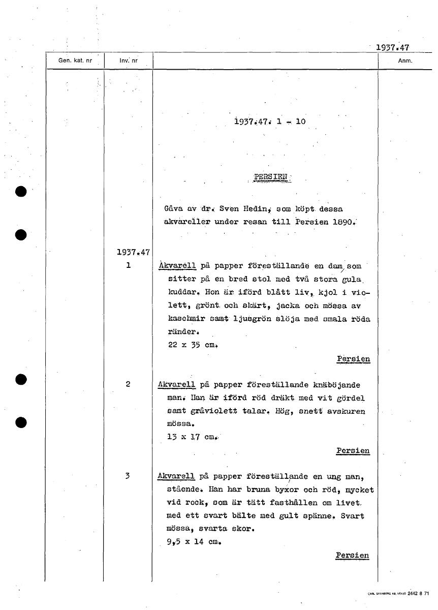 1937.47 Iriv. l937:47: 1 - 10 PERSIT Gåva av dr. Sven Hedin som köpt dessa akvareller under resan till Persien 1890; 1937.47 1 Akvarell på papper föreställande en dam, som sitter på en bred stol med två stora gula kuddar. Hon är iförd blått liv, kjol i vio- lett, grönt och skärt, jacka och mössa av kaschmir samt ljusgrön slöja med smala röda ränder. 22 x 35 cm. Persien 2 Akvarell på papper föreställande knäböjande man. Han är iförd röd dräkt med vit gördel samt gråviolett talar. Hög, snett avskuren mössa. 13 x 17 cm., Persien 3 Akvarell på papper föreställande en ung man, stående. Han har bruna byxor och röd, mycket vid rock, som är tätt fasthållen om livet, med ett evart bälte med gult spänne. Svart mössa, svarta skor. 9.5 x 14 em. Persien [ocr]