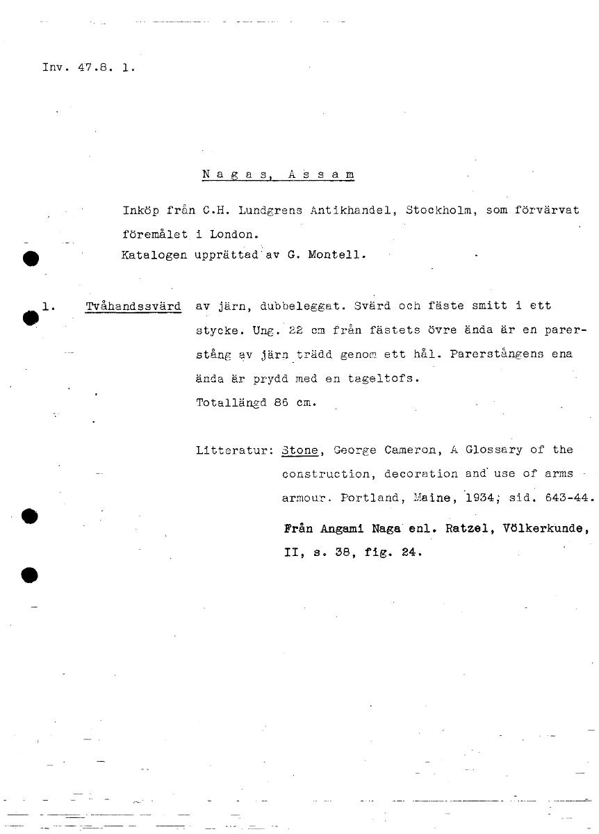• Inv. 47.8. 1. Nagas, Absam Inköp från C.H. Lundgrens Antikhandel, Stockholm, som förvärvat föremålet. i London. Katalogen upprättad'av G. Montell. 1. Tvåhandssvärd av järn, dubbeleggat. Svärd och fäst... Visa hela