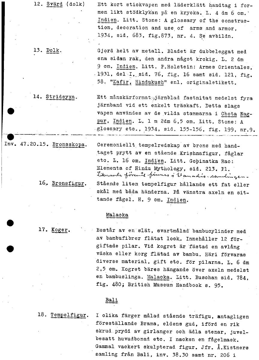 12. Svärd (dolk) Ett kort stickvapen med läderklätt handtag i for- men likt stödklykan på en krycka. L. 4 dm 6 cm.' Indien. Litt. Stone: A glo.ssary of the construc- tion, decoratdon and use•of arms .and armor, 1934, sid. 683, fig.873, nr. 4. Se avbildn. 13. Dolk. Gjord helt av metall. Bladet är dubbeleggat med ena sidan rak, den andra något krokig. L. 2 dm 9 cm. Indien. Litt. P.Holstein: Armes. Orientales, _1931, delI,_sid. 76, fig. 16 samt sid. 121, fig. 58. "Kafir, Hindukush" enl. originaletikett. 14. Stridsyxa.. Ett månskärformatjärnblad fastnitat medelst fyra järnband vid ett enkelt träskaft. Detta slags vapen användes av de yilda stammarna i Chota yag- pur, Indien. L. 1 m 2dm 6,5 cm. Litt. Stone: A. _glossary etc., 1934, sid. 155-156, fig. 199, nr.9. e-- Inv. 47:20.15. Bronsskap... 0eremaniellt,tempelredskapaV brons med hand- taget prytt av en stående Krishnafigur, fåglar etc. L. 16 cm. Indien. Litt. Gognatka Rao: Elements. of Hindu Mythology, sid. 213. Pi. c4• - A - I6, Bronsfigur. Stående liten tempelfigur hållande ett fat eller skål med båda händerna. På vänstra axeln en sit- tande fågel. H. 9 cm. Indien. Malacka • 17. Koger. Består av en slät, svartmålad bambucylinder med av bambufibrer flätat lock,. Innehåller 12 för- giftade pilar. Vid kogret är fästad en avlång • väska-eller korg flätad av bambu. Häri.förvaras diverse material, gift etc. för pilarna. L. 6 dm 2,5 cm. Kogret. bäres hängande över axeln medelst en bambuslinga. Malacka. Litt. Buschan sid. 784, fig. 480; British Museum Handbook s. 95. Bali 18. Tempelfigur. I olika färger målad stående träfigu, antagligen föreställande Brama, eldens gud, iförd en rik skrud prydd av girlanger och ädla stenar, juvel- besatt huvudbonad etc. I nacken en fågelmask. Gammal vackert skulpterad figur. Jfr. I.Kistners samling från Bali, inv. 38.30 samt nr. 206 i [ocr]