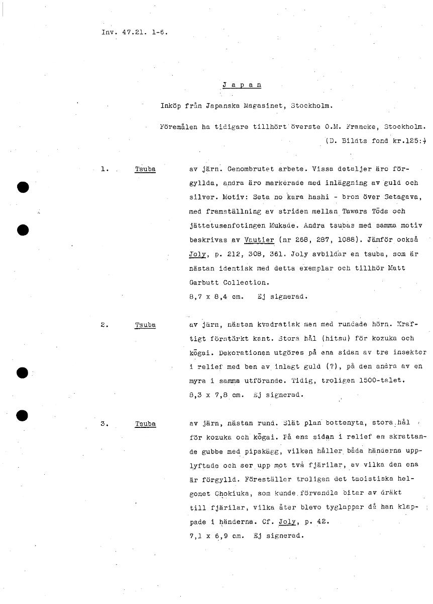 Inv. 47.21. 1-6. Japan Inköp från Japanska Magasinet, Stockholm. Föremålen ha tidigare tillhört'överste 0.M. Francke, Stockholm. AD. Bildts fond kr.125:4 1. Tåuba av järn. Genombrutet arbete. Vissa detaljer äro för- gyllda, andra äro markerade med inläggning av guld och silver. Motiv: Seta no kara hashi - bron över Setagava, med framställning av striden mellan Tawara rada och jättetusenfotingen Mukade. Andra tsubas med samma motiv beskrivas av Vautier (nr 268, 287, 1088). Jämför också Joly, p. 212, 308, 361. Joly avbildhr en tsuba, som är nästan identiak med detta eXemplar och tillhör Matt Garbutt Collection. 8,7 x 8,4 cm. Ej signerad. 2. Tsuba av järn, nästan kvadratisk men med rundade hörn, Kraf- tigt förstärkt kant. Stora hål (hitsu) för kozuka och kögai. Dekorationen utgöres på ena sidan av tre insekter i relief med ben av inlagt guld (?), på den andra av en myra i samma utförande. Tidig, troligen 1500-talet. 8,3 x 7,8 am. Ej signerad. 3. Tsuba av järn, nästan rund. Slät plan bottenyta, stora,hål för kozuka och' kögai. Få ena sidan i relief en skrattan- de gubbe med pipskägg, vilken håller båda händerna upp- lyftade och ser upp mot två fjärilar, av vilka den ena är förgylld. Föreställer troligen det taoistiska hel- gonet Chokiuka, som kunde.förvandla bitar av dräkt till fjärilar, vilka åter blevo tyglappar då han klap- pade i händerna. Cf. Joly, p. 42. 7,1 x 6,9 cm. Ej signerad. [ocr]