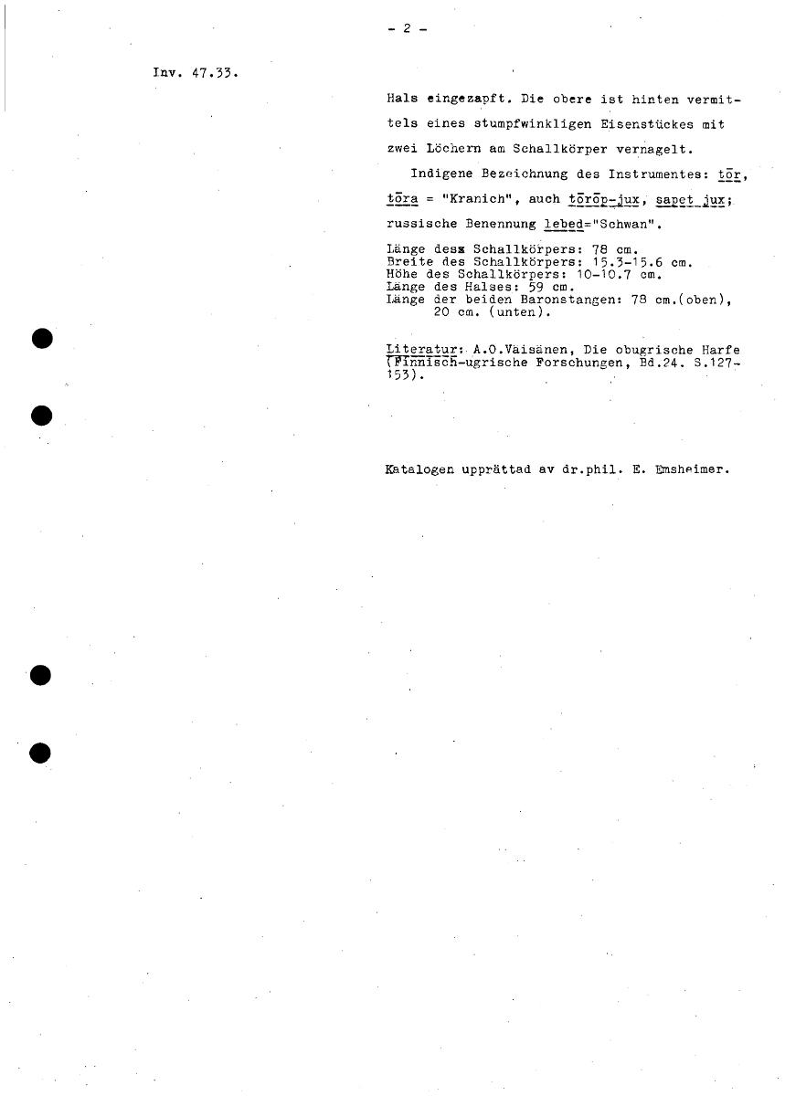 2 Inv. 47.33. Hals eingezapft. Die obere ist hinten vermit- tels eines stumpfwinkligen Eisenstiickes mit zwei Löchern am Schallkörper vernagelt. Indigene Bezeichnung des Instrumentes: tEr, tSra = "Kranich", auch tErEprjux; suet_lux; russische Benennung lebed="Schwan". Länge dess Schallkörpers: 78 cm. Breite des Schallkörpers: 15.3-15.6 cm. Höhe des Schallkörpers: 10-10.7 cm. Länge des Halses: cm. Länge der beiden Baronstangen: 78 cm.(oben), 20 cm. (unten). Literatur:, A.O.Väisänen, Die obugrische Harfe rginnigEH-Ugrische Forschungen, Bd.24. S.127- 153). Katalogen upprättad av dr.phil. E. Emsheimer. [ocr]Stäng