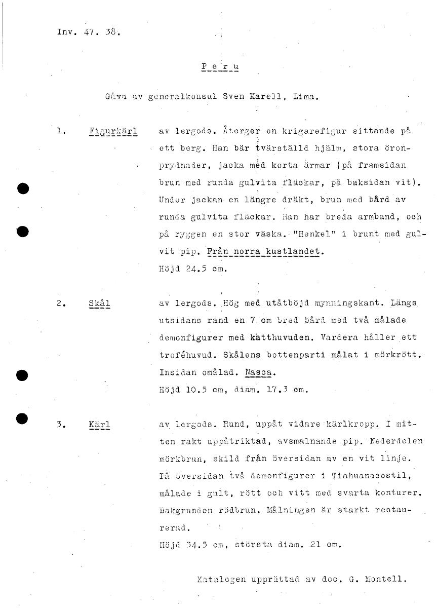 Inv. 47. 38.. Peru Gåva av generalkonsul Sven Karell, Lima. 1. Fiuurkärl av lergods. 7iterger en krigarefigur sittande på ett berg. Han bär tvärställd hjälm, stora öron- prydnader, jacka med korta ärmar (på framsidan brun med runda gulvita fläckar, baksidan vit). Under jackan- en längre dräkt, brun med bård av runda gulvita fläckar. 'dan har breda armband, och på rygen en stor väska. "Henkel" i brunt med gul- vit pip. Från norra kustlandet. Höjd 24.5 cm. 2. Skål av lergods. .Hög med utåtböjd mynningskant. Längs utsidans rand en 7.cm bred bård med två målade demonfigurer med kåtthuvuden. Vardera håller .ett trofåhuvud. Skålens bottenparti målat i mörkrött.' Insidan omålad. Nasca. Höjd 10.5 cm, diam. 17.3 cm. 3. av lergods. Rund, uppåt vidare'kärlkropp. I mit- ten rakt upoåtriktad, avsmalnande pip. Nederdelen mörkbrun, skild från översidan av en vit linje. FLöversidan två demonfigurer i Tiahuanacostil, målade i gult, 2.--tt och vitt med svarta konturer. Bakgrunden rödbrun. Målningen är starkt restau- rerad. Höjd 34.5 em, största diam. 21 cm. Katalogen upprättad av doc. . Montell. [ocr]