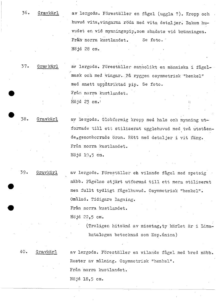 36. Gravkärl av lergods. Föreställer en fågel (uggla ?). Kropp och huvud vitalvingarna röda med vita detaljer. Bakom hu- vudet en vid mynningspip,som skadats vid bränningen. Fråh-norra kustlandet. Se foto. Höjd 28 cm. 37. Gravkärl aV lergods. Föreställer sannolikt en människa i fågel- mask och med Vingar..På ryggen osymmetrisk '"henkel" med snett upPåtriktad pip. se foto. Från norra kustlandet. Höjd 23 cm.1 • 38. Gravkärl av lergods. Globformig kropp med hals och mynning ut-• formade till ett stiliserat ugglehuvud med två Utståen- de,genomborrade öron. Rött med detaljer i vit färg. Från norra kustlandet. Höjd 19,5 åm. 39. Gravkärl av lergods. Föreställer eh vilande fågel med spetsig näbb. Fågelns. stjärt utformad till ett mera stiliserat men fullt tydligt fågelhuvud. Osymmetrisk "henkel". OMålad. Tidigare lagning. 110 Från norra lcustlandet. Höjd 22,5 cm'. (Troligen hitsänd av misstag,ty kärlet är i Lima- katalogen betecknad som Esp.finica) 40. Gravkärl av lergods. Föreställer en vilande fågel med bred näbb. Rester av målning. Osymmetrisk "henkel". Från norra kustlandet Höjd 18,5 cm. [ocr]Stäng
