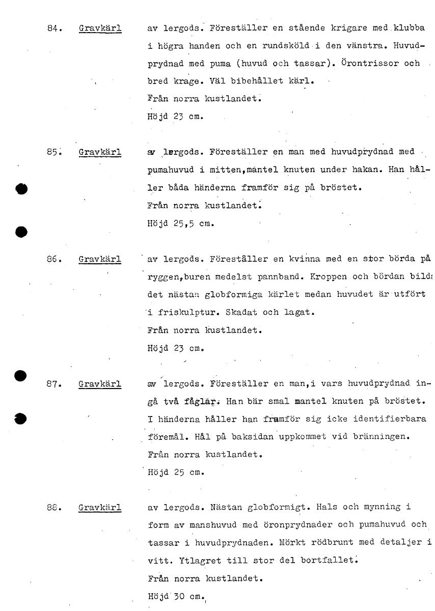 • 84. Gravkärl av lergods. Föreställer en stående krigare med klubba i högra handen och en rundsköld.i den vänstra. Huvud- prydnad med puma (huvud och tassar). Örontrissor och bred krage. Väl bibehållet... Visa hela
