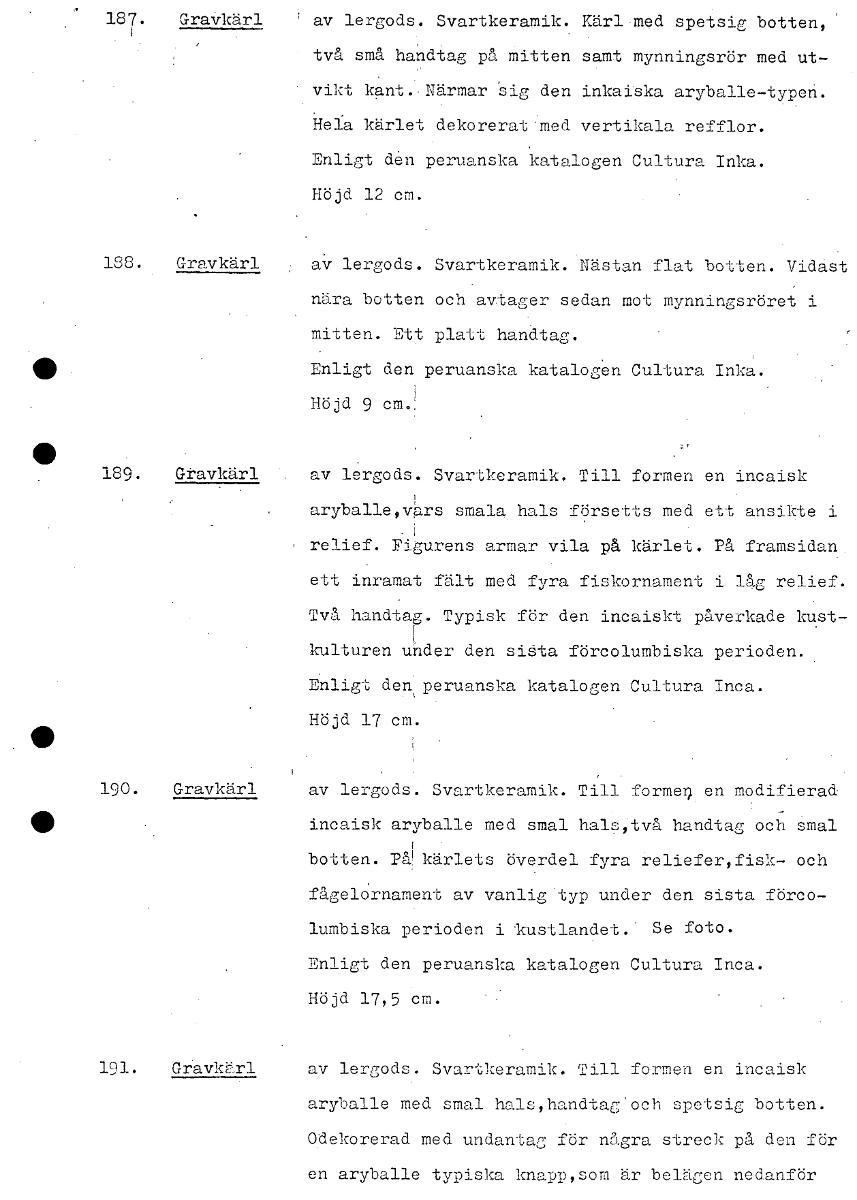 187. Gravkärl av lergods. Svartkeramik. Kärl-med spetsig botten, två små handtag på mitten samt mynningsrör med ut- vikt kant.,Närmar Sig den inkaiska aryballe-typen. Hela kärlet dekorerat med vertikala refflor. Enligt dån peruanska katalogen Cultura Inka. Höjd 12 cm. 198. Gravkärl aÅr lergods. Svartkeramik. Nästan flat botten. Vidast nära botten och avtager sedan mot mynningsröret i mitten. Ett platt handtag. Enligt den peruanska katalogen Cultura Inka. Höjd 9 cm.! 189. Gravkärl av lergods. Svartkeramik. Till formen en incaisk aryballe,v4rs smala, hals försetts med ett ansikte i . i , relief. Figurens armar vila på kärlet. På framsidan. ett inraMat fält med fyra fiskornament i låg relief. Två handtag. Typisk för den incaiskt påverkade kust- kulturen under den siåta förcolumbiska perioden. Enligt den peruanska katalogen Cultura Inca. Höjd 17 cm. 190. Gravkärl av lergods. Svartkeramik. Till formen en modifierad incaisk aryballe med smal hals,två handtag och smal botten. PN kärlets överdel fyra reliefer,fisk- och fågelOrnament av vanlig typ under den sista förco- lumbiska perioden i kustlandet. Se foto. Enligt den peruanska katalogen Cultura Inca. Höjd 17,5 cm. 191. Gravkärl av lergods. Svartkeramik. Till formen en incaisk aryballe med smal hals,handtag'och spetsig botten. Odekorerad med undantag för några streck på den för en aryballe typiska knapp,som är belägen nedanför [ocr]