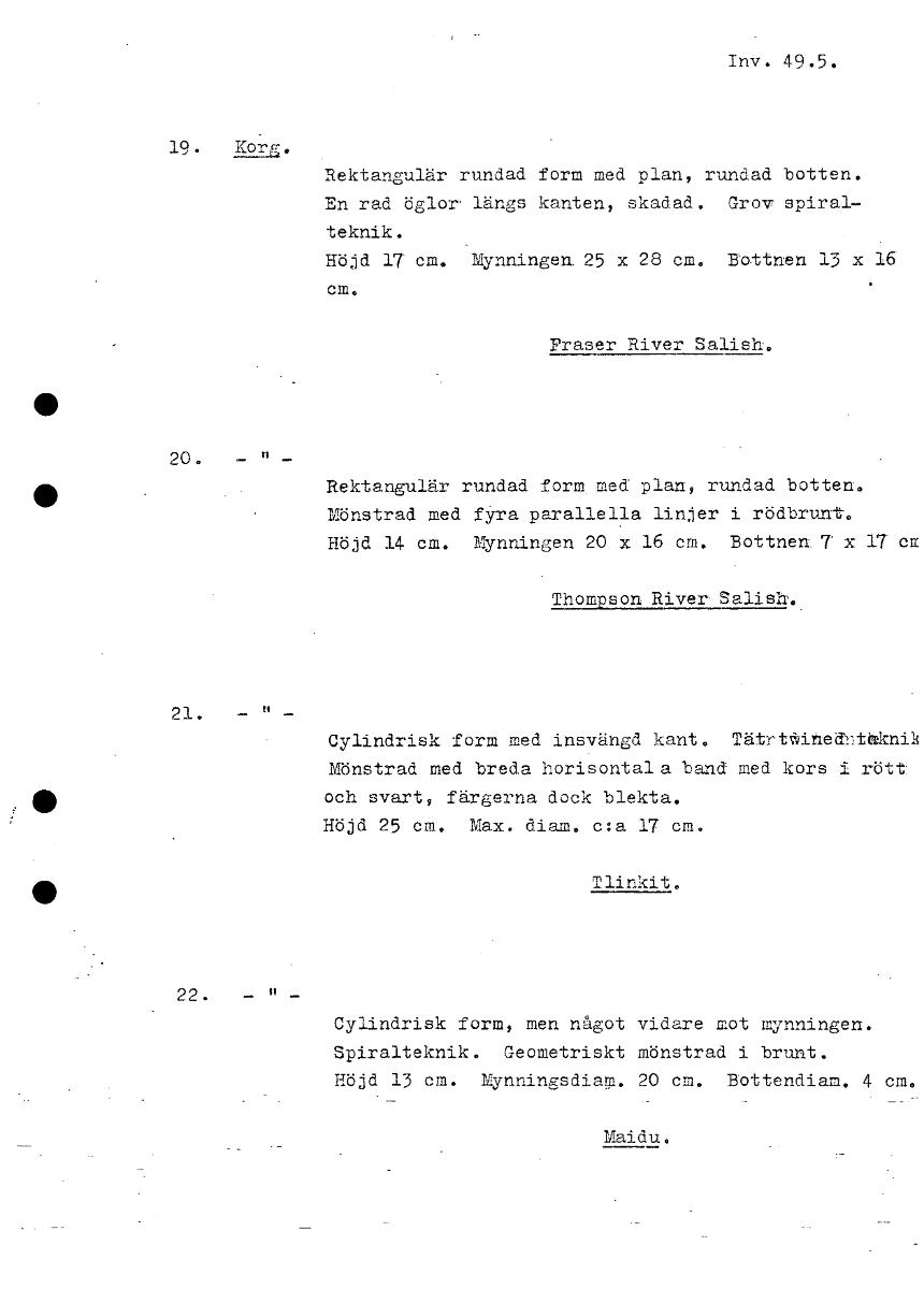 Inv. 49.5. 19. g2L.G. Rektangulär rundad form med plan, rundad botten. En rad öglor längs kanten, skadad. Grov spiral- teknik. Höjd 17' cm. Mynningen. 25 x 28 cm. Bottnen 13 x 16 Fraser River Salish. • 20. • Rektangulär rundad form. med plan, rundad botten. Mönstrad med fyra parallella linjer i rödbrunt. Höjd 14 cm. Mynningen 20 x 16 cm. Bottnen. x 17 cm Thompson River- Salish. 21. Cylindrisk form med insvängd kant. Tätrttinedrtkni Mönstrad med breda horisontala band med kors i rött: och svart, färgerna dock blekta. Höjd 25 cm. Max. diam. c:a 17 cm. • Tlinkit. 22. Cylindrisk form, men något vidare mot mynningen. Spiralteknik. Geometriskt mönstrad i brunt. Höjd 13 cm. Mynningsdian. 20 cm. Bottendiam. 4 cm. Maidu. [ocr]Stäng