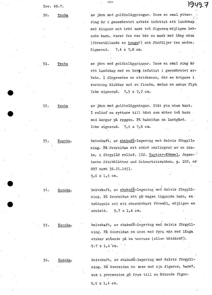 • Inv. 49.7. 30. Tsuba av järn med guldinläggningar. Inom en smal ytter ring är i genombrutet arbete infattat ett landskap med klippor och träd samt två figurer, möjligen lek- ande barn, varav den ene b... Visa hela