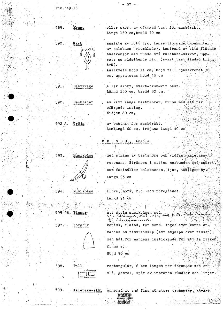 -57- 49 589. Krage eller skört av ofärgad bast för maskdräkt. Längd 160 cm,bredd 30 cm 590. , Mask ansikte av rött tyg, lansettformade,ögonkantet av kalebass (vitmålade), kantband, av vitaflåtade bast...