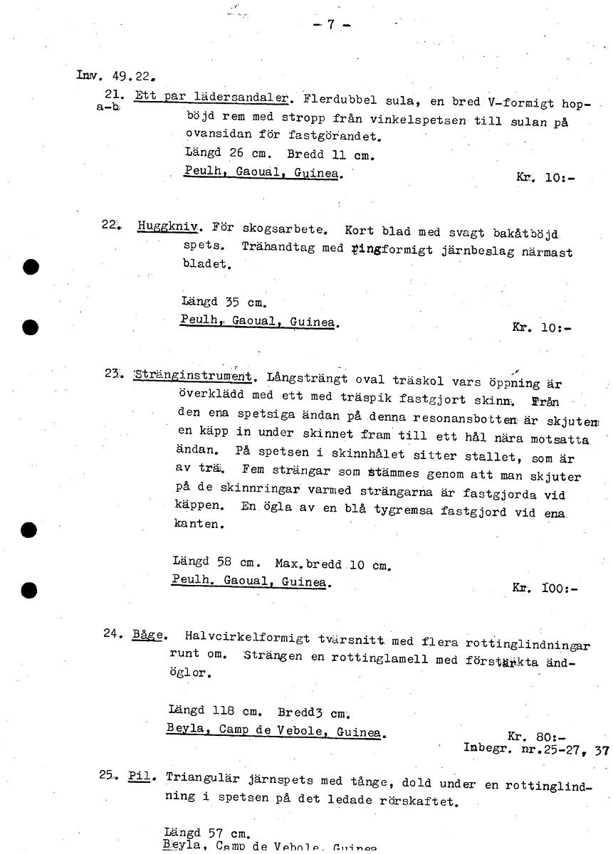 lav. 49.22. 21. Ett par lädersandaler. Flerdubbel sula, en bred V-formigt hop- a-b böjd rem med stropp från vinkelspetsen till sulan på ovansidan för fastgörandet. Längd 26 cm. Bredd 11 cm. Peulh, Gaouål Guinea. Kr. 10:- 22. Huggkniv. För skogsarbete. Kort blad med svagt bakåtböjd spets. Trähandtag med ringformigt järnbeslag närmast bladet. Längd 35 cm. Peulh, Gaoual, Guinea. Kr. 10:- - , • 25. Stränginstruntent. Långsträngt oval träskol vars öppning är. överklädd med ett med träspik fastgjort skinn. från den ena spetsiga ändan på .denna resonansbotten är skjuten en käpp in under skinnet fram till ett hål nära motsatta. ändan. På spetsen i skinnhålet sitter stallet, som är av trä. Fem strängar som Stämmes genom att man skjuter på de skinnringar varmed strängarna är fastgjorda vid käppen.- En. ögla av en blå tygremsa fastgjord vid ena. kanten. Längd 58 cm. Max, bredd .10 cm. Peulh. Gaoual, Guinea. Kr. 100:- 24. Båge. Halvcirkelformigt tvärsnitt med flera rottinglindningar runt om. Strängen en rottinglamell med förstäitkta änd- öglor. Längd 118 cm. Bredd3 Beyla, Camp de Vebole, Guinea. Kr. 80:- Imbegr. nr.25-27, 3i 25. Pil. Triangulär järnspets med tånge, dold under en rottinglind- ning i spetsen på det ledade rörskaftet. Längd 57 cm. Reyla, Can) de VPhr 1 [ocr]