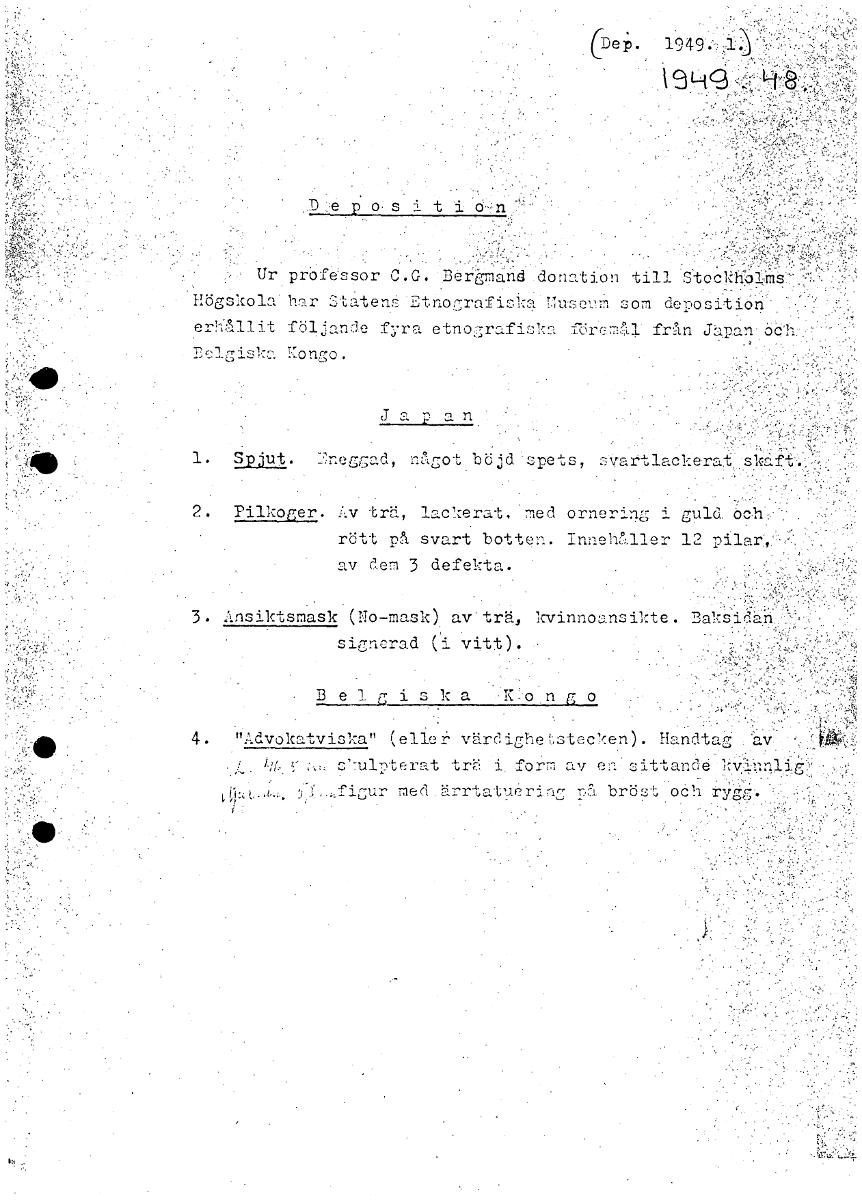 • (De p. 1949. 19k D e p-0. s i t Ur prefessor C.G. Bergmand donation till Stockfilms Högskola hrar St n: Etnocrafiska T.:useuM som depositioner!-Ällit följande fyra etnojraf-iska förmål från Japn-åell:... Visa hela