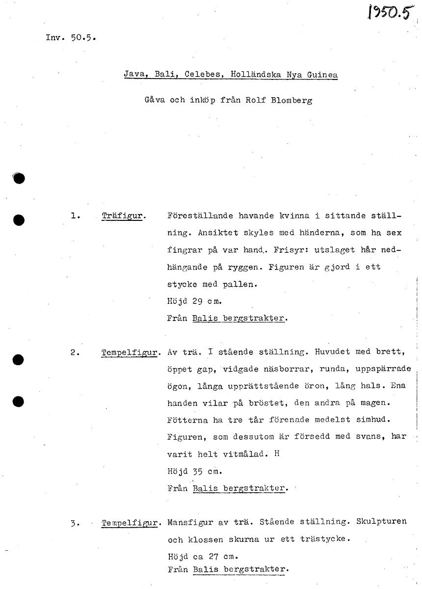 .1590.5- Inv. 50.5. Java, Balii Celebes, Holländska Nya Guinea Gåva och inköp från Rolf Blomberg • 1. Träfigur. Föreställande havande kvinna i sittande ställ- ning. Ansiktet skyles med händerna, som ha sex fingrar på var hand,. Frisyr: utslaget hår ned- hängande på ryggen. Figuren är gjord i ett stycke med pallen. Höjd 29 cm. Från Balis bergstrakter. 2. Tempelfigur. Av trä. I stående ställning. Huvudet med brett, öppet gap, 'vidgade näsborrar, runda, uppspärrade 1 ögon, långa upprättstående öron, lång hals. Ena i handen vilar på bröstet; den andra på magen. Fötterna ha tre tår förenade medelst simhud. Figuren, som dessutom är försedd med svans, har varit helt vititålad H Höjd 35 cm. Från Balis bergstrakter. 3. • Tempelfigur. Mansfigur av trä. Stående ställning. Skulpturen och klossen skurna ur ett trästycke. Höjd ca 27 cm. Från Balis bergstrakter. [ocr]