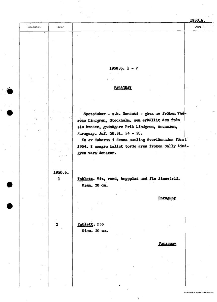 1950.6. 1950.6. 1 - 7 PARAGUAY Spetsdukar - s.k. aanduti - gåva av fröken Th6 rese Lindgren, Stockholm, som erhållit dem från sin broder, godsägare Erik Lindgren, Asunion, Paraguay. Ja. 50.31. 54 - 56. En av dukarna i denna samling överlämnades förs 1954. I senare fallet torde även fröken Sally Lin gren vara donator. 1950.6. 1 Tablett. Vit, rund, knypplad med fin linnetråd. Diam. 20 cm. ~ax 2 Tablett. D:o Diam. 20 cm. Paraffins' [ocr]