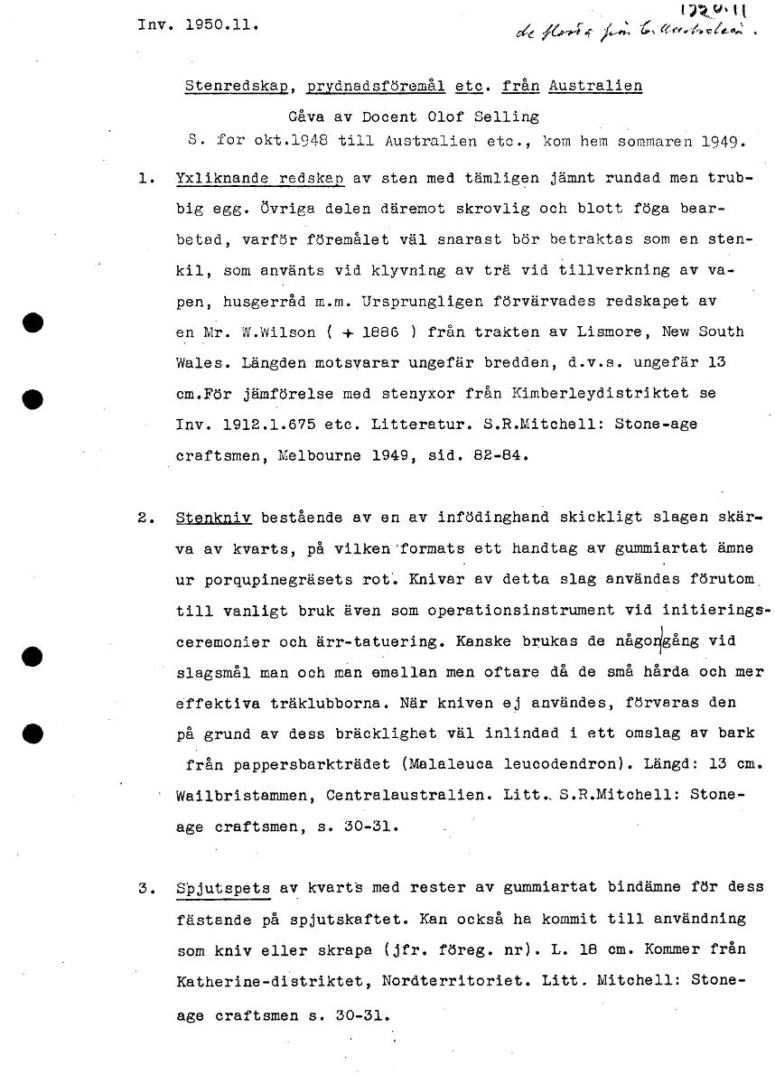 v t Inv. 1950.11. /64,, Stenredskap, prydnadsföremål etc. från Australien Gåva av Docent Olof Selling • S. for okt.1948 till Australien etc., kom hem sommaren 1949. 1. Yxliknande redskap av sten med t...