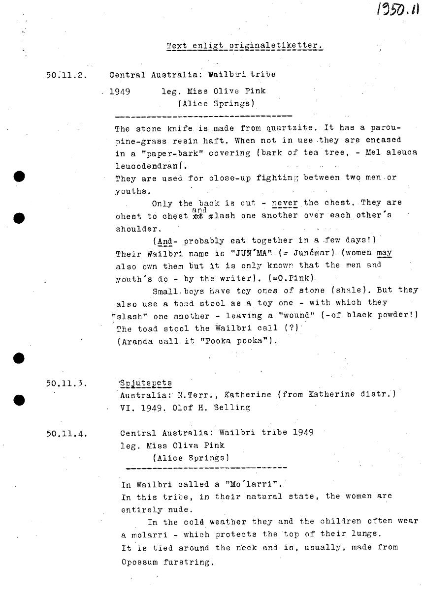 1550,11 Text enligt originaletiketter. 50.11.2. Central Australia: Wailbri tribe 1949 leg. Miss Olive Pink (Alice Springs) The stone knife-is. made from quartzite. It has a parcu- pine-grass resin haft. When not in use-they are entased in a "paper-bark" covering (bark of tea tree, - Mel aleuca leucodendran). They are used for close-up fighting between two men.or youths. Only the back is cut - never the chest..They are and chest t6 chest e-pt s,lash one another over each other's shoulder. (And- probably eat together in a .few days!) Their Wailbri name is "JUNPMA"- (= Junemar). Nomen may also öwn them låt it is only know:n that the men and youth's do - by the writer). Small.boys have toy oxes of stone (shale). But they also use a toad stool as a.toy one - with.which they "slask" one another - leaving a "wound" (-of black powder!) The toad stool the Wailbri call (?)' (Aranda call it "Pooka pooka"). 50.11.3. 'SDlutuets 'Australia: N.Terr., Katherine (from Katherine distr.) VI. 1949, Olof H. Selling 50.11.4. Central Australia:' Wailbri tribe 1949 leg. Miss Oliva Pink (Alice Springs) In Wailbri called a "Mo'larri". In this tribe, in their natural state, the women are entirely nude. In the cold weather they and the children often wear a molarri - which protects the top of their lungs. It is tied around the neck and is, usually, made from Opossum furstring. [ocr]