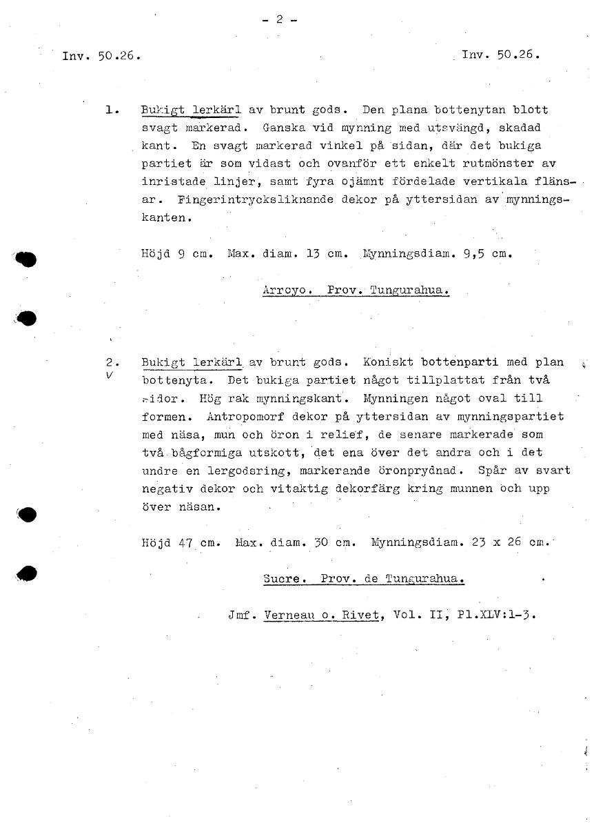 2 Inv. 50.26. Inv. 50.26. 1. Bukigt lerkärl av. brunt gods. Den plana bottenytan blott svagt markerad. Ganska vid mynning med utsvängd, skadad kant. En svagt markerad vinkel på 'sidan, där det bukiga ...