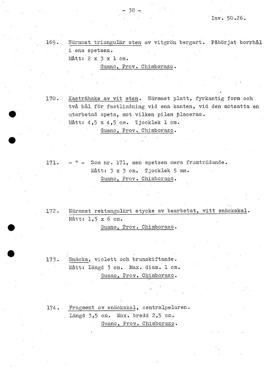 38 Inv. 50.26. 169. Närmast triangulär sten av vitgrön bergart. Påbörjat borrhål i ena spetsen. - Mått: 2 x 3 x 1 cm. Guanot_Prov. Chimborazo. 170. Kasträhake av vit sten. Närmast platt, fyrkantig form och två hål, för fastlindning vid ena kanten, vid den motsatta en utarbetad spets, mot vilken pilen placeras. Mått: 4,5 x 4,5 cm. Tjocklek 1 cm. Guano, Prov. Chimborazo. 171. - " - Som nr. 171, men•spetsen mera framträdande. Mått: 3 x 3 cm. Tjocklek 5 mm. Guano, Prov. Chimborazo. 172. Närmast rektangulärt stycke av bearbetat, vitt snäckskal. Mått: 1,5 x 6 cm.. • Guano, PrOv. Chimborazo. 173. Snäcka, violett och brunskiftande. Mått: Längd 3 cm. Max. diam. 1 cm. Guano, Prov. Chimborazo. 174. Fragment av snäckskal, centralpelaren. Längd 3,5 cm. Max. bredd 2,5 cm. Guano, Prov. Chimborazo. [ocr]