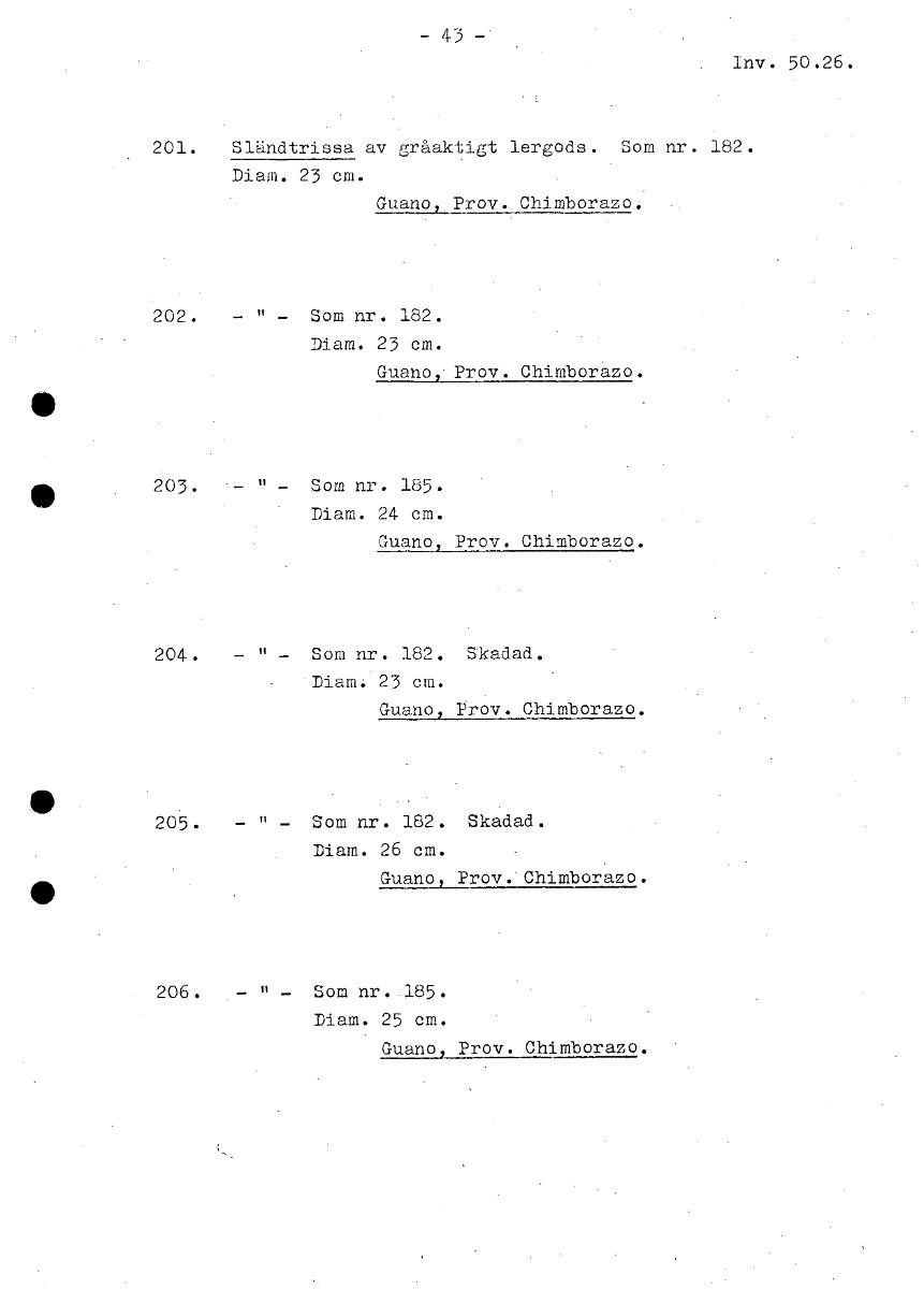 • -43- Inv. 50.26. 201. Sländtrissa av gråaktigt lergods. Som nr. 182. Diam. 23 cm. Guano,Prov. Chimborazo. 202. - " - Som nr. 182. Diam. 23 cm. Guano,' Prov. Chimborazo. 203. - " - Som nr. 185. Diam. 2... Visa hela