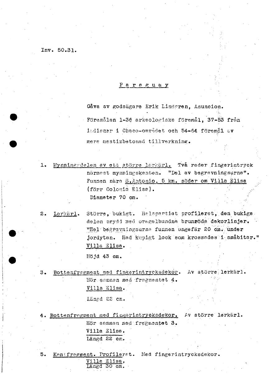 Inv. 50.31. Parapu!La Gåva av godsägare Erik Lind-ren, Asunciom. Föremålen 1-36 arkeoloiska föremål, 37-53 från i.5= i Clinco-omrdet och 540.64 förem.n av • mer estizbetonad tillverkning. 1. Mynnindelen av ett större 16rkäri. Två rader fingerintryck narmnst mynniwakenten. "Del av begrevningsurna". Funnen nära S.AlltUnio 5 km. söder om Villa Elisa (förr Colonia Elisa). Diameter 70 cm. 2. Lerkärl. Större, bukiYt. ht17,cnrtiet profilerat, den bukige delon prydd id oregelbundna brunr5d0 dekorlinjer. • "1551-'beth-avnino.surn:3 funnen ungefär 20 oia.tinder jordytan. Hed kupigt lock som krossades'ismåbitar. Villa Ensa. • Höjd 43 cm. 3. Bottenfrtgment med fingerintrycksdekår. Av större ;lerkärl. Hör..sommen med.frngmentat 4. Villa lisa. Längd 22 cm. 4. BottenfreTment med fi£Korintr.ckedekor. Av- större 'lerkärl. Hör -samman medfrgginentet 3. Villa Ensa. Längd 22 cm. . 5. Knnefregment. Profilertt. Med fingerintrycksdekor. Villa Elisa. Längd 30 cm. - [ocr]Stäng