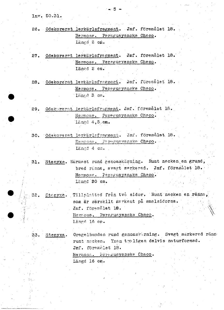 50,3 . 26. 0dekoreret lerkärlsfregment. Jmf. föremålet 18. Hermose. Partguayanske •Cheeo. Längd 2 04. 27. Odekoreret lerkärlsfregment. alf. föremålet 18. Hermose. Peraguevenska Checo. LähSd 2 cm. 28. ...