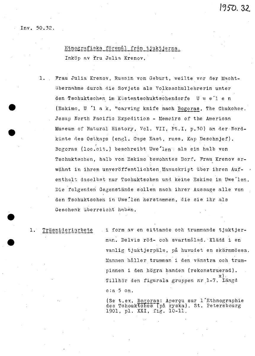 1957). 324 Inv. Etnografiska föremål från tkuktlerna. Inköp av fru Julia Krenov, 1. Frau Julia Krenov, Russin von Geburt, weilte vor der Macht- äbernahme durch die SoVjets als Volksschullehrerin unter...