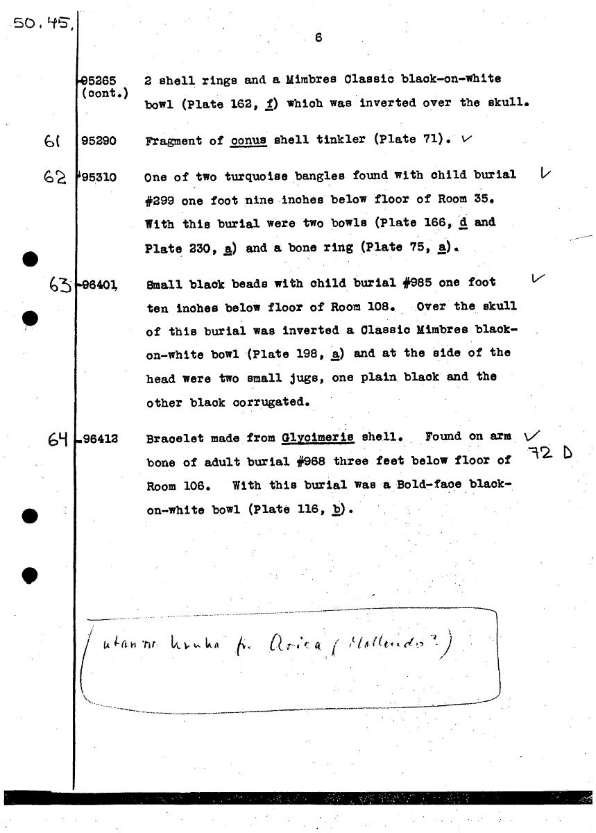 50 6 5265 2 shell rings and a Mimbres Olassio blank-on-white (oont.) bowl (Plats 162, f) whioh was inverted over the skull. 6( 95290 Fragment of oonus shell tinkler (Plats 71). v 95310 One of two turq...