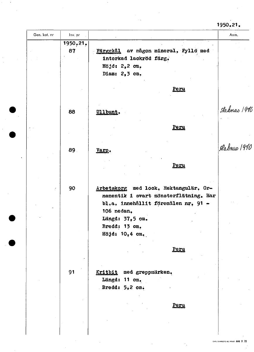 • 1950 21. 1950.21. 87 Färnekål av någon mineral. Fylld med intorkad lackröd färg.' Höjd: 2.2 om. Diam: 2,3 cm. Peru 88 U1] bunt. OdAttu Ofb Peru gåtkiii» 190 89 Peru 90 Arbetskorg med lock. Rektangulär... Visa hela