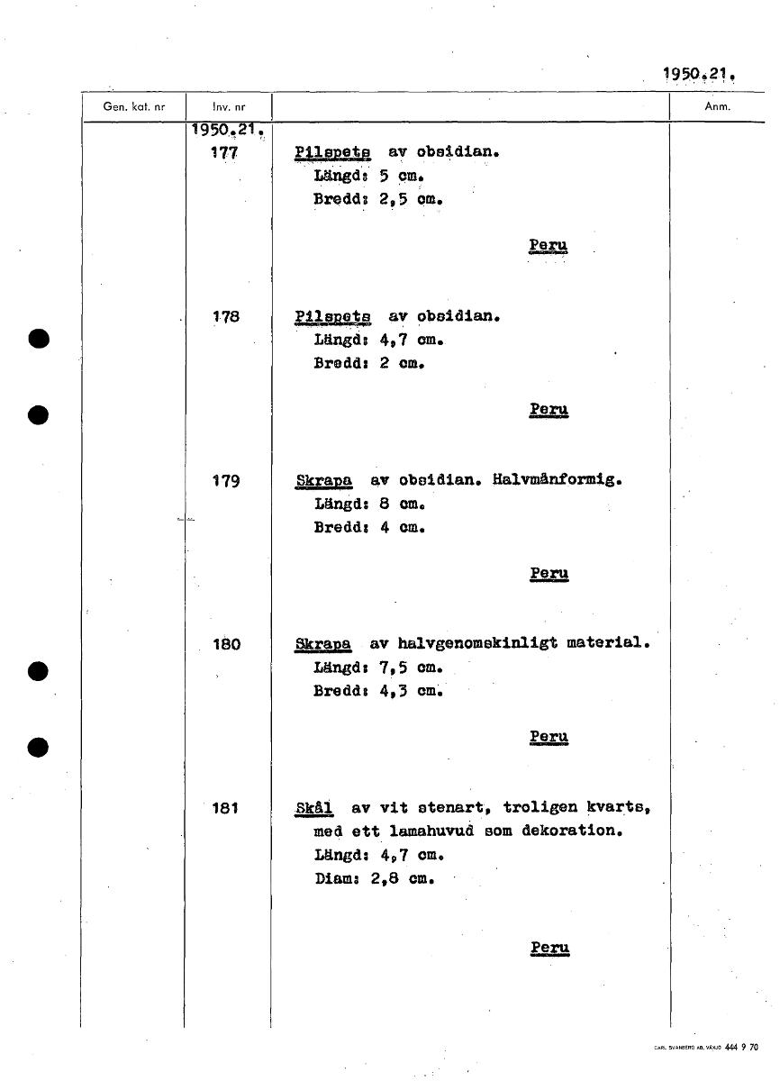 1950.21 • 1950.2 177 Pilspets av obsidian. Längds 5 om. Bredd: 2,5 om. Peru 178 Pilspets av obsidian. Längd: 4,7 cm. Bredd: 2 om. • Peru 179 Skrapa av obsidian. Halvmånformig. Längd: 8 om. Bredd: 4 om...