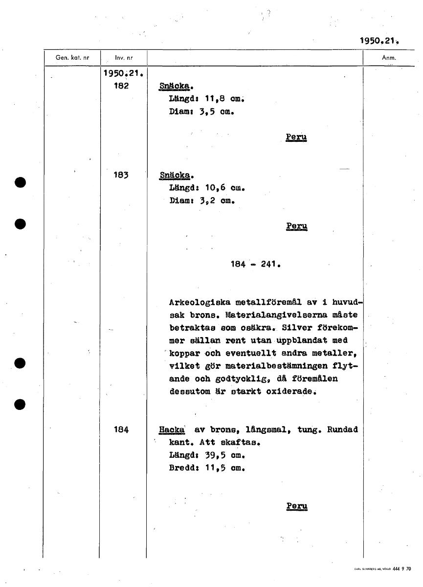 1950.21. 1950:21, 182 Snäcka. Längd: 11,8 om. Diam: 3,5 om. Peru 183 Snäcka. Längd: 10,6 cm. Diam: 3,2 om. • Peru 184 - 241. Arkeologiska metallföremål av i huvud- sak brons. Materialangivelserna måst...