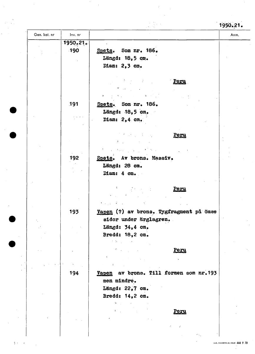 195ö.g1. •959:021.„ 190 ,Spets. Som nr. 186. Längd: 18,5 014. Diam: 2,3 cm. 191 Aula., Som nr. 186. Längd: 18,5 cm, Diam: 2,4 cm. Peru 192 Set : Av brons. Massiv. Längd: 28 cm. Diam: 4 cm. £2a 193 Vap...