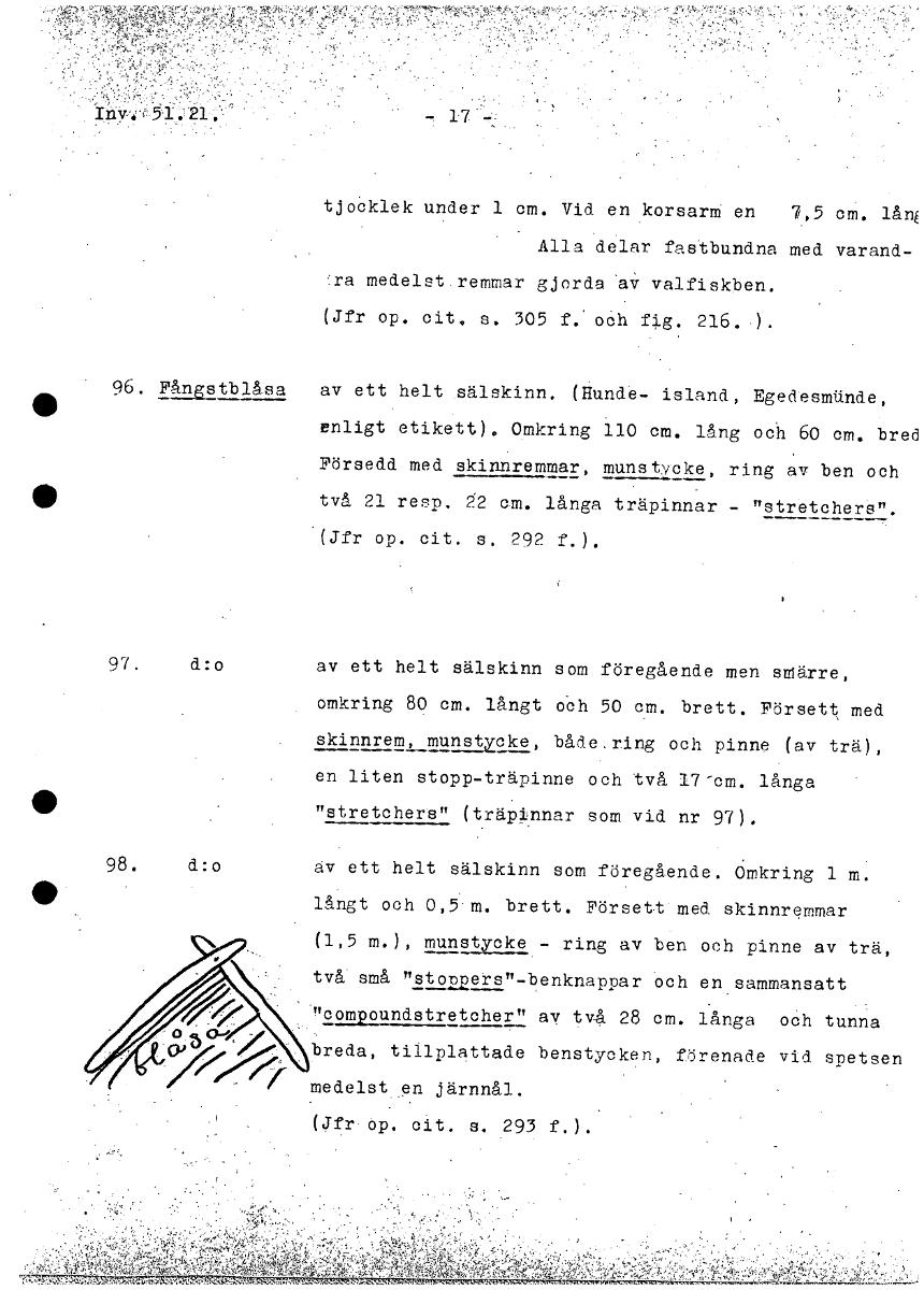 tjoCklek under 1 cm. Vid en korsarm. en 7,5 cm. lån Alla delar fastbundna med varand- ra medelst remmar gjorda av valfiskben. (Jfr op. cit, s. 305 f. och fig. 216. 96. Fångstblåsa av ett helt sälskinn...