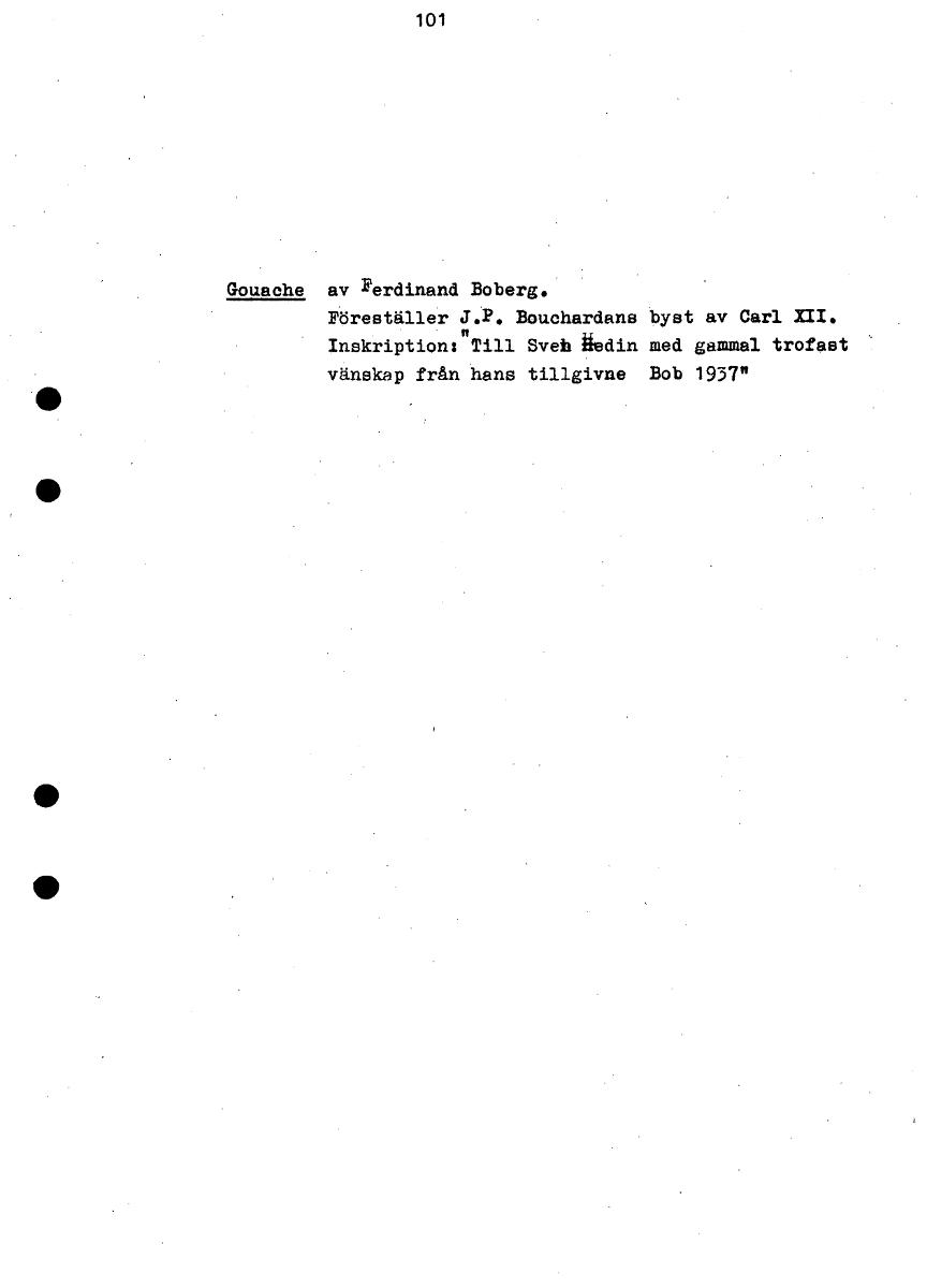 • 101 Gouache av Ferdinand Boberg. Föreställer J.P. Bouchardans byst av Carl XII. Inskription: n Till Sveh fledin med gammal trofast vänskap från hans tillgivne Bob 1937" • • [ocr]