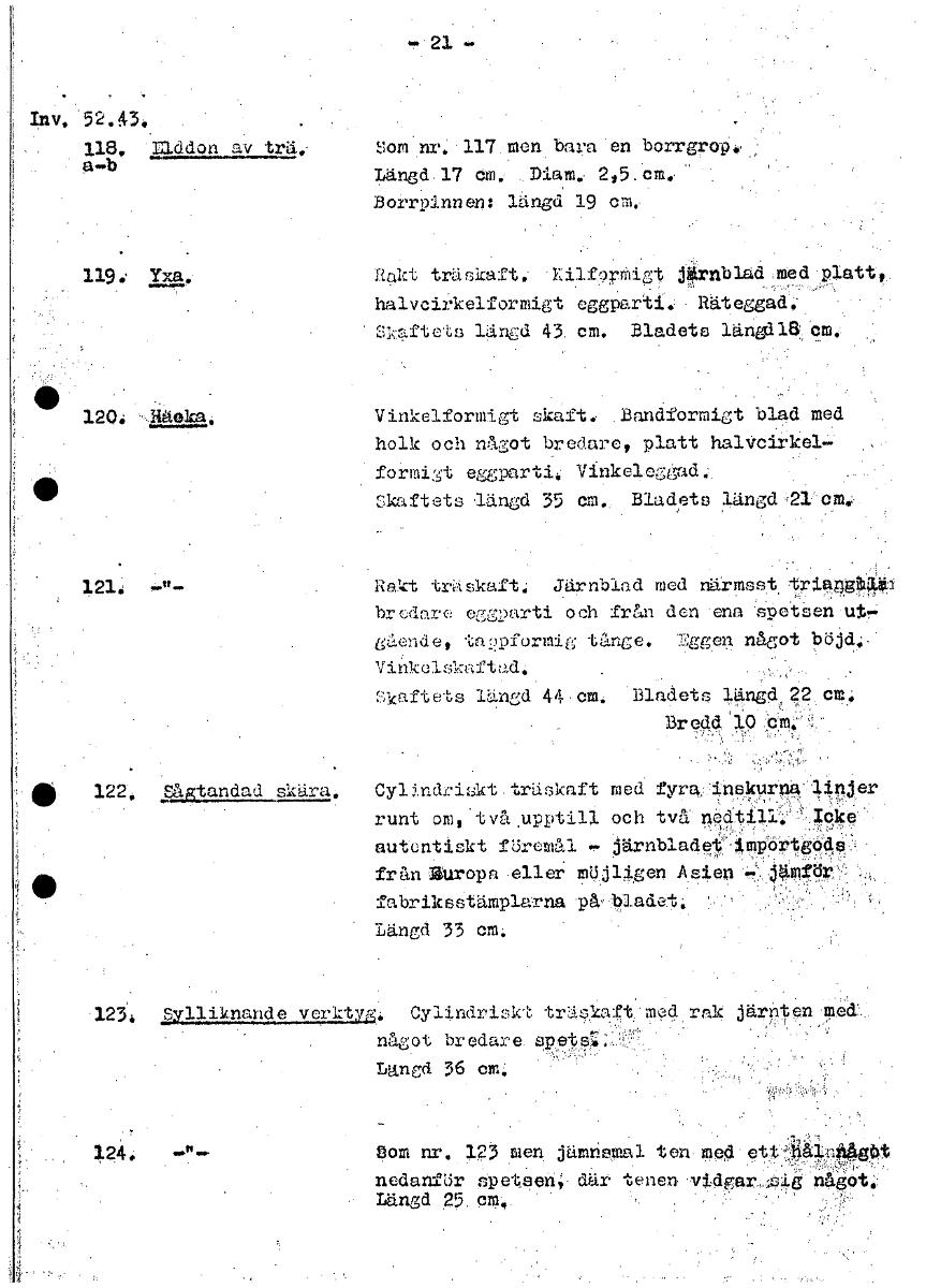 .T.•21 in 52.43. 118. Elddon av trä. Som nr. 117 men bara en borrgrop., a.b Längd 17 cm. Diam. 2,5. cm: Borrpinnen: långd 19 om. 119 Rakt träskaft. Kilfprmist jgrnblad ,med ,platt halvcirkelformigt eg...